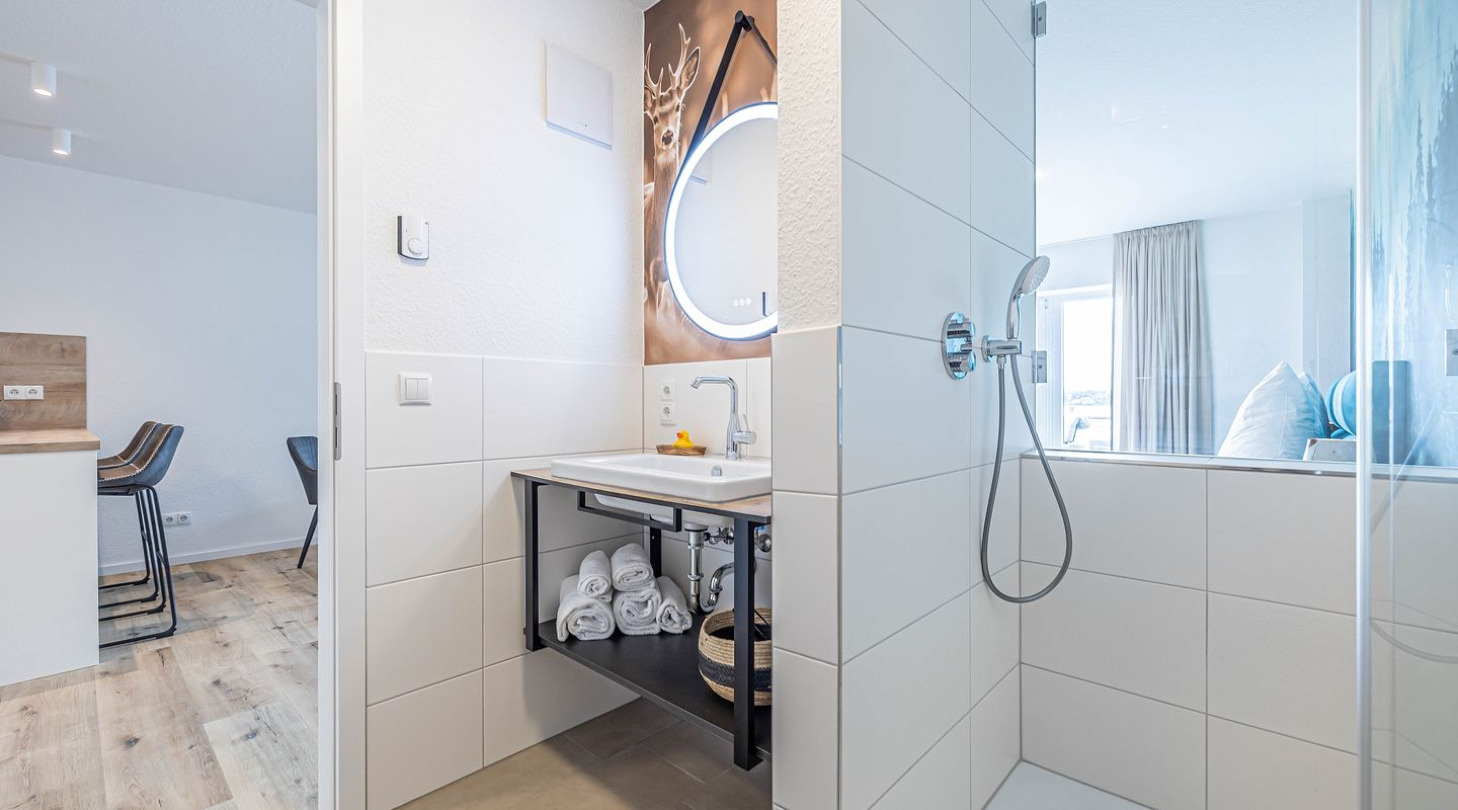 With a direct view of the water and in a unique location directly on the Schlei, “Viking berth 4” at Pionierhafen Schleswig offers the perfect place for your vacation. The apartment on the 1st floor offers an open living and dining area with kitchen and adjoining open bedroom, a bathroom and a balcony on approx. 45m². The fully equipped kitchen leaves nothing to be desired and in the living room you can end your vacation days on the sofa in front of the Smart TV. The bedroom offers a cozy double bed (180x200cm), as well as blackout options for restful nights. In the bathroom you will find a hairdryer and a shower. You can relax on the balcony and round off your vacation days on balmy evenings. A private parking space is available directly in front of the house. You can store your bicycles in the open, shared bicycle room. A washing machine for communal use is available free of charge on the first floor of the neighboring Fjord- and Schleikojen houses. Sustainability is important at Pionierhafen, which is why 77% of the energy is supplied by geothermal energy. The building has an elevator. Your four-legged friend is also very welcome.