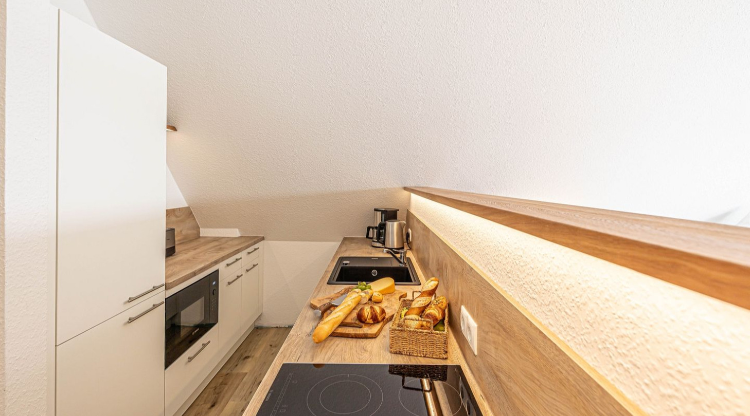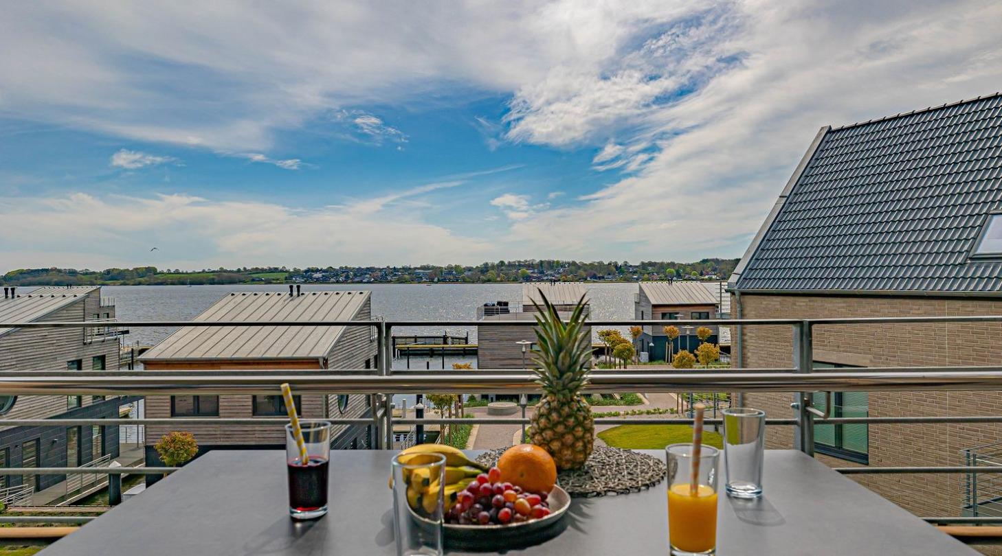 With a direct view of the water and in a unique location directly on the Schlei, the “Viking berth 10” at the Pionierhafen Schleswig offers the perfect place for your vacation. The apartment on the 3rd floor offers an open living and dining area with kitchen and adjoining open bedroom, a bathroom and a balcony on approx. 40m². The fully equipped kitchen leaves nothing to be desired and in the living room you can end your vacation days on the sofa in front of the Smart TV. The bedroom offers a cozy double bed (180x200cm), as well as blackout options for restful nights. In the bathroom you will find a hairdryer and a shower. You can relax on the balcony and round off your vacation days on balmy evenings. A private parking space is available directly in front of the house. You can store your bicycles in the open, shared bicycle room. A washing machine for communal use is available free of charge on the first floor of the neighboring Fjord- and Schleikojen houses. Sustainability is important at Pionierhafen, which is why 77% of the energy is supplied by geothermal energy. The building has an elevator.