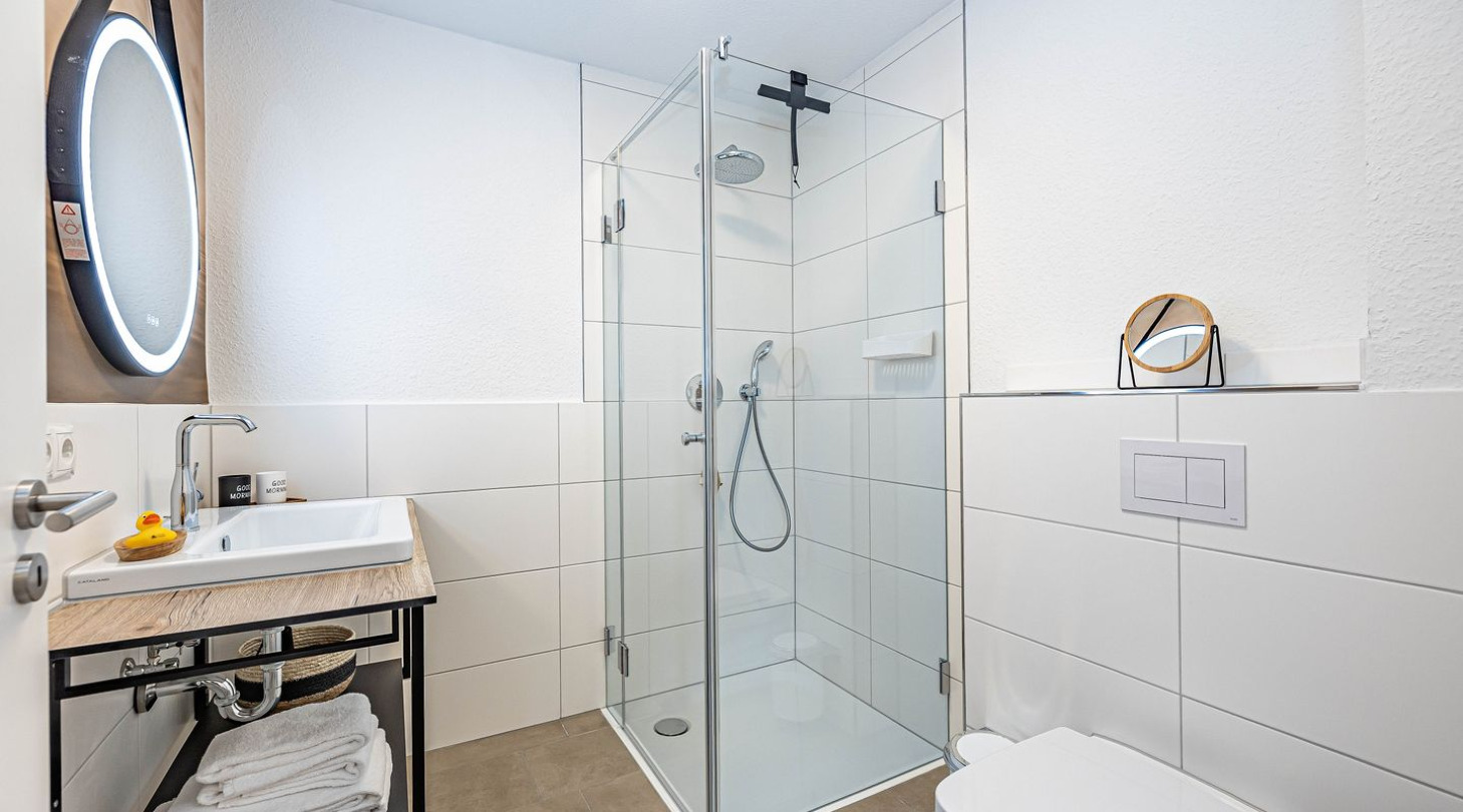 With a direct view of the water and in a unique location directly on the Schlei, the “Viking berth 11” at the Pionierhafen Schleswig offers the perfect place for your vacation. The spacious 66m² apartment offers an open-plan living and dining area with kitchen and sleeping area, a bathroom and a balcony. The fully equipped kitchen leaves nothing to be desired and in the living room you can end your vacation days on the sofa in front of the Smart TV. The sleeping area offers a comfortable double bed (180x200cm), as well as blackout facilities for restful nights. In the bathroom you will find a hairdryer and a shower. You can relax on the balcony and round off your vacation days on balmy evenings. A private parking space is available directly in front of the house. You can store your bicycles in the open, shared bicycle room. There is a washing machine on the first floor for communal use free of charge. Sustainability is important at Pionierhafen, which is why 77% of the energy is supplied by geothermal energy. The building has an elevator.