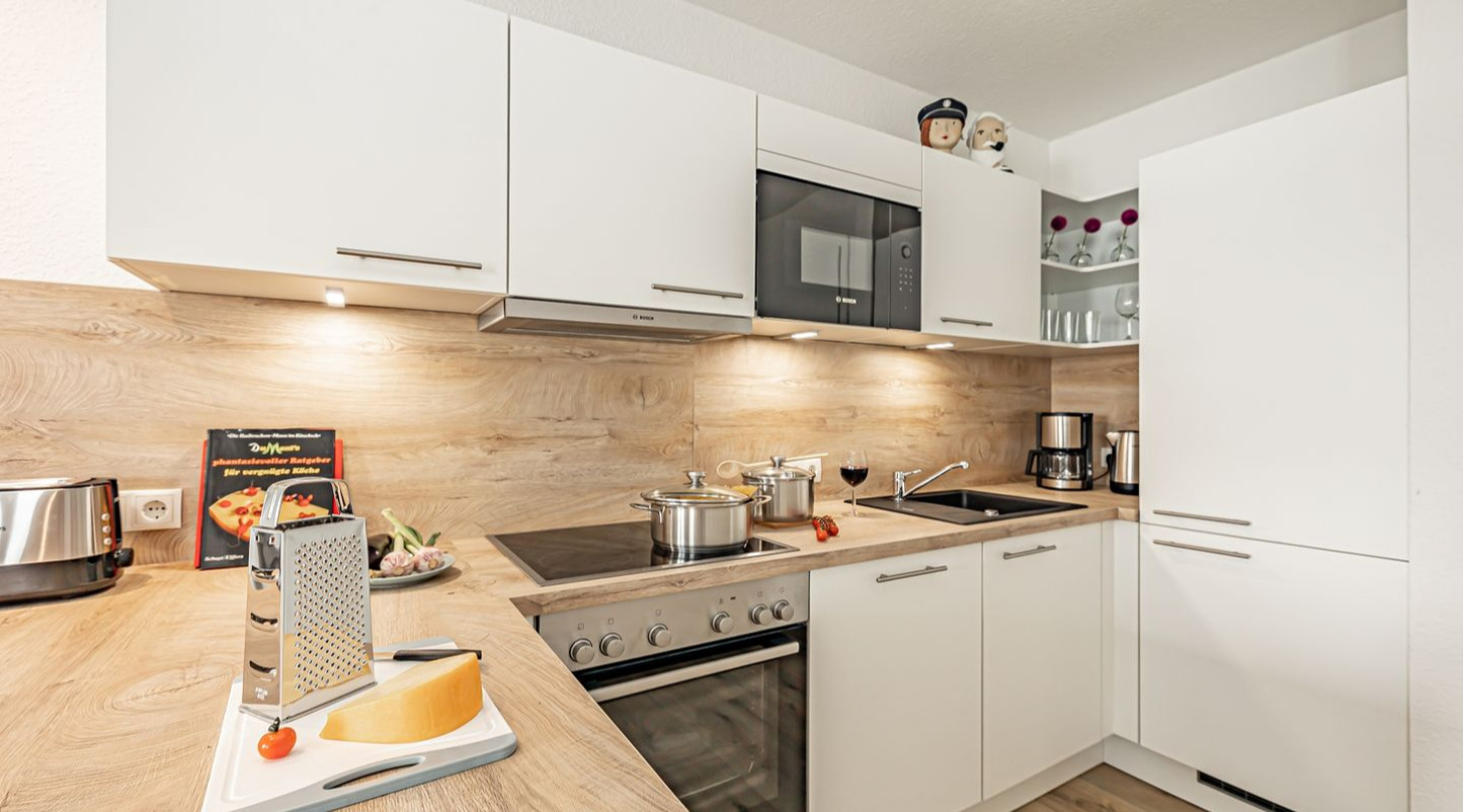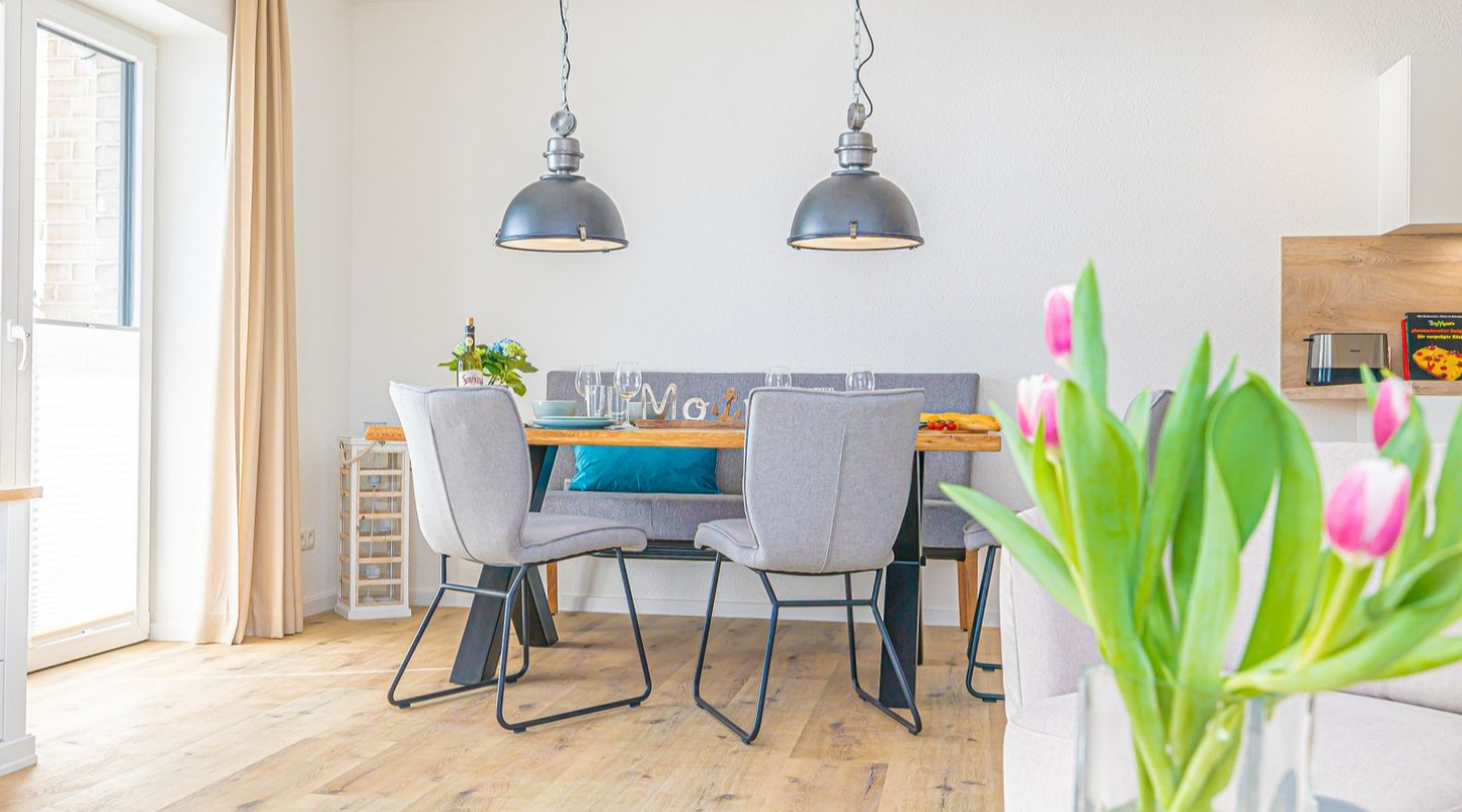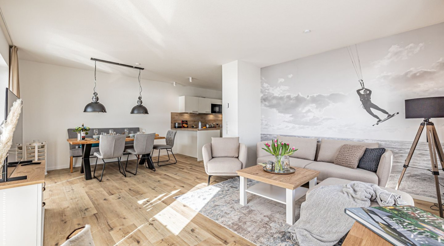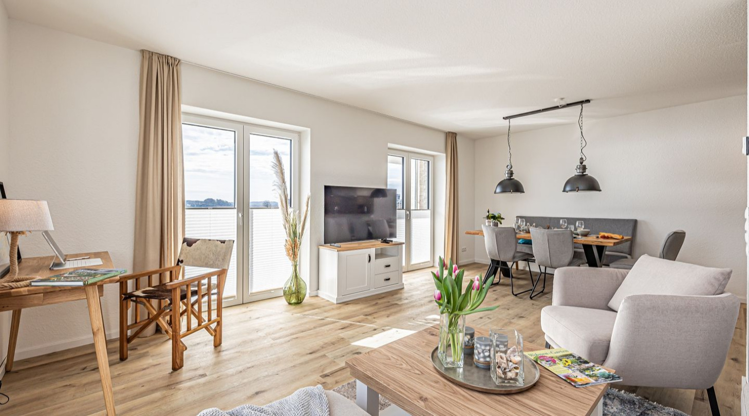 With a direct view of the water and in a unique location directly on the Schlei, “Schlei berth 3” at Pionierhafen Schleswig offers the perfect place for your vacation. The apartment on the 1st floor offers an open living and dining area with kitchen, two bedrooms, a bathroom and a balcony on approx. 71m². The fully equipped kitchen leaves nothing to be desired and in the living room you can end your vacation days on the sofa in front of the Smart TV. for restful nights. One bedroom offers a cozy double bed (180x200cm) and blackout options for restful nights. The other bedroom has two single beds (90x200cm each) and blackout facilities. In the bathroom you will find a hairdryer and a shower. You can relax on the balcony and round off your vacation days on balmy evenings. A private parking space is available directly in front of the house. You can store your bicycles in the open, shared bicycle room. There is a washing machine on the first floor for communal use free of charge. Sustainability is important at Pionierhafen, which is why 77% of the energy is supplied by geothermal energy.