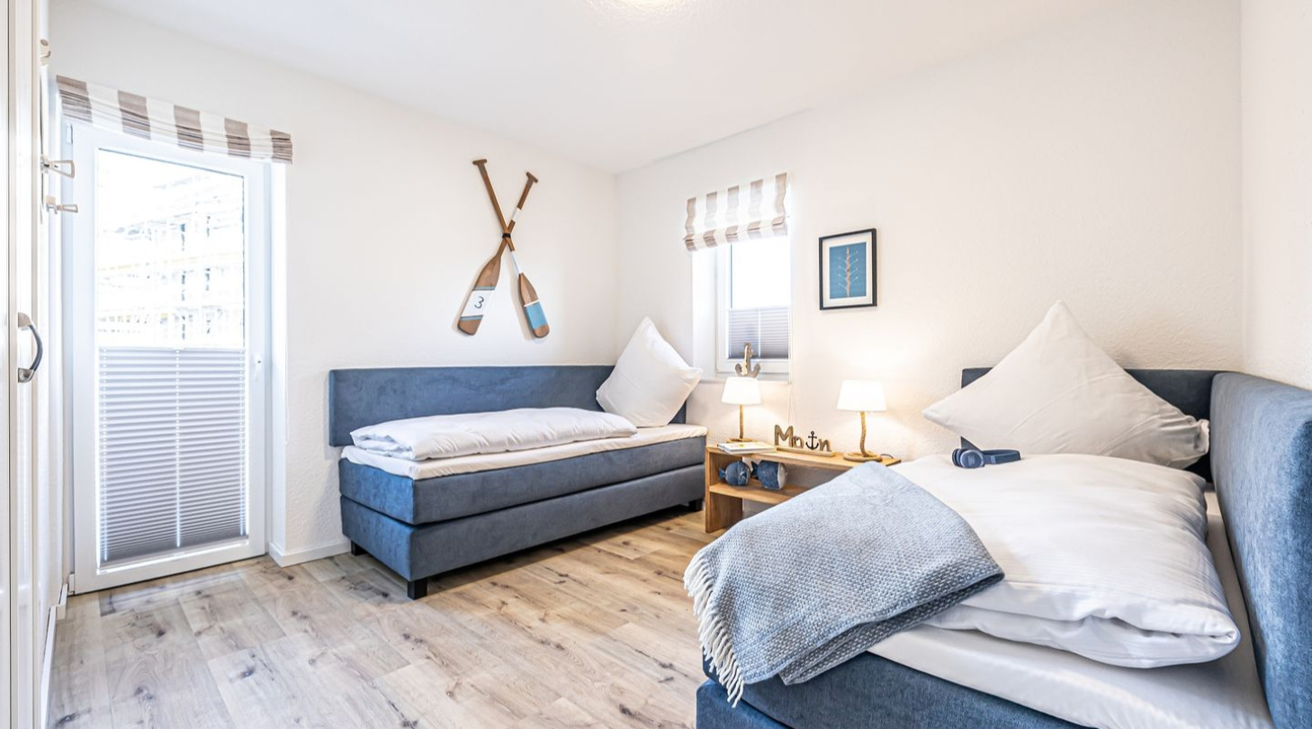With a direct view of the water and in a unique location directly on the Schlei, “Fjord berth 3” at Pionierhafen Schleswig is the perfect place for your vacation. The modern apartment offers a spacious living area of 71 m², 2 bedrooms and a bathroom, as well as a balcony with a fantastic view of the Schlei. The fully equipped kitchen leaves nothing to be desired and in the living room you can end your vacation days on the sofa in front of the Smart TV. One bedroom offers a cozy double bed (180x200cm) and blackout options for restful nights. The other bedroom has two single beds (90x200cm each) and blackout options. You can relax on the balcony and round off your vacation days on balmy evenings. You have your own parking space directly in front of the house. You can store your bicycles in the open, shared bicycle room. There is a washing machine on the first floor for communal use free of charge. Sustainability is important at Pionierhafen, which is why 77% of the energy is supplied by geothermal energy.