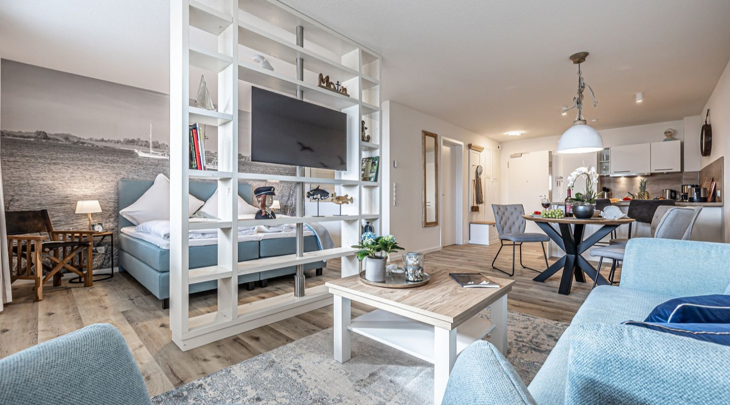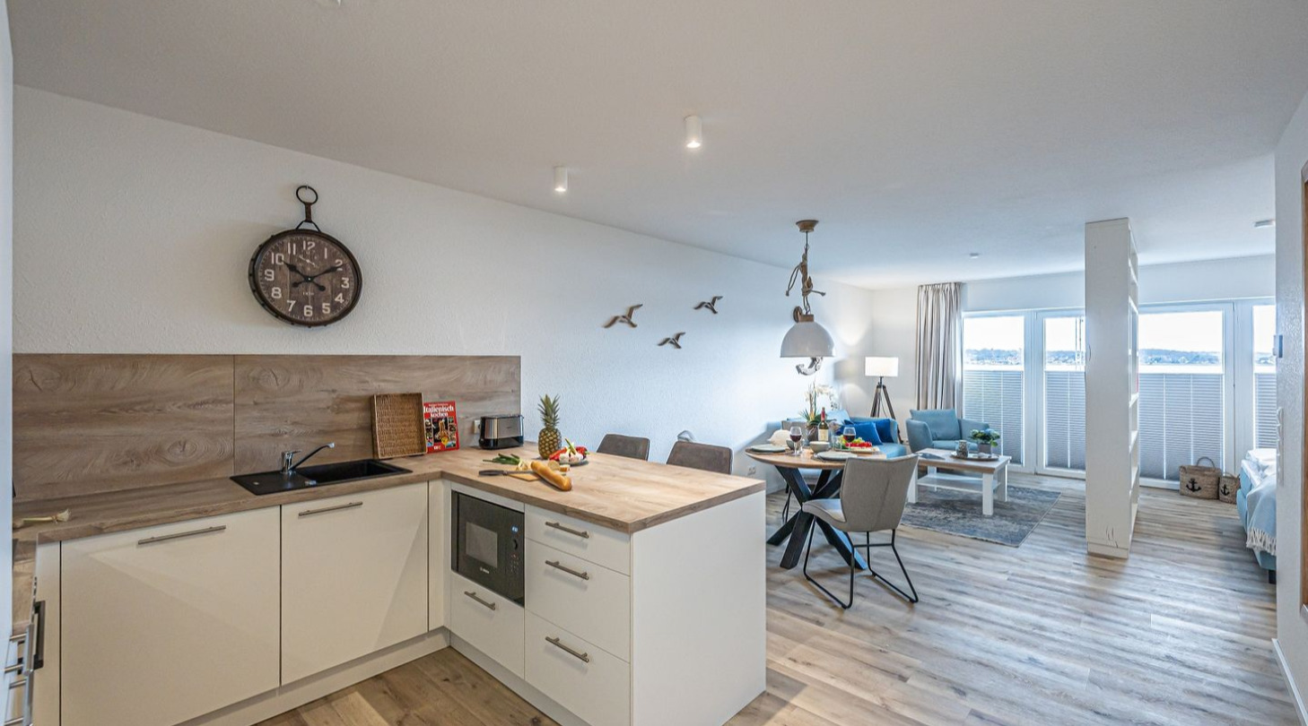 With a direct view of the water and in a unique location directly on the Schlei, “Schlei berth 4” at Pionierhafen Schleswig offers the perfect place for your vacation. The apartment on the 1st floor offers an open living and dining area with kitchen and adjoining open bedroom, a bathroom and a balcony on approx. 45m². The fully equipped kitchen leaves nothing to be desired and in the living room you can end your vacation days on the sofa in front of the Smart TV. The bedroom offers a cozy double bed (180x200cm) as well as blackout options for restful nights. In the bathroom you will find a hairdryer and a shower. You can relax on the balcony and round off your vacation days on balmy evenings. A private parking space is available directly in front of the house. You can store your bicycles in the open, shared bicycle room. There is a washing machine on the first floor for communal use free of charge. Sustainability is important at Pionierhafen, which is why 77% of the energy is supplied by geothermal energy.