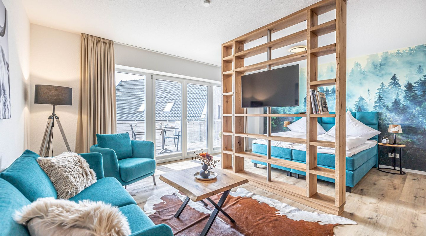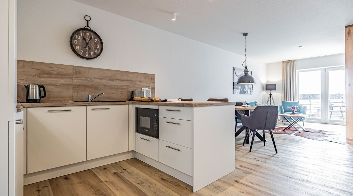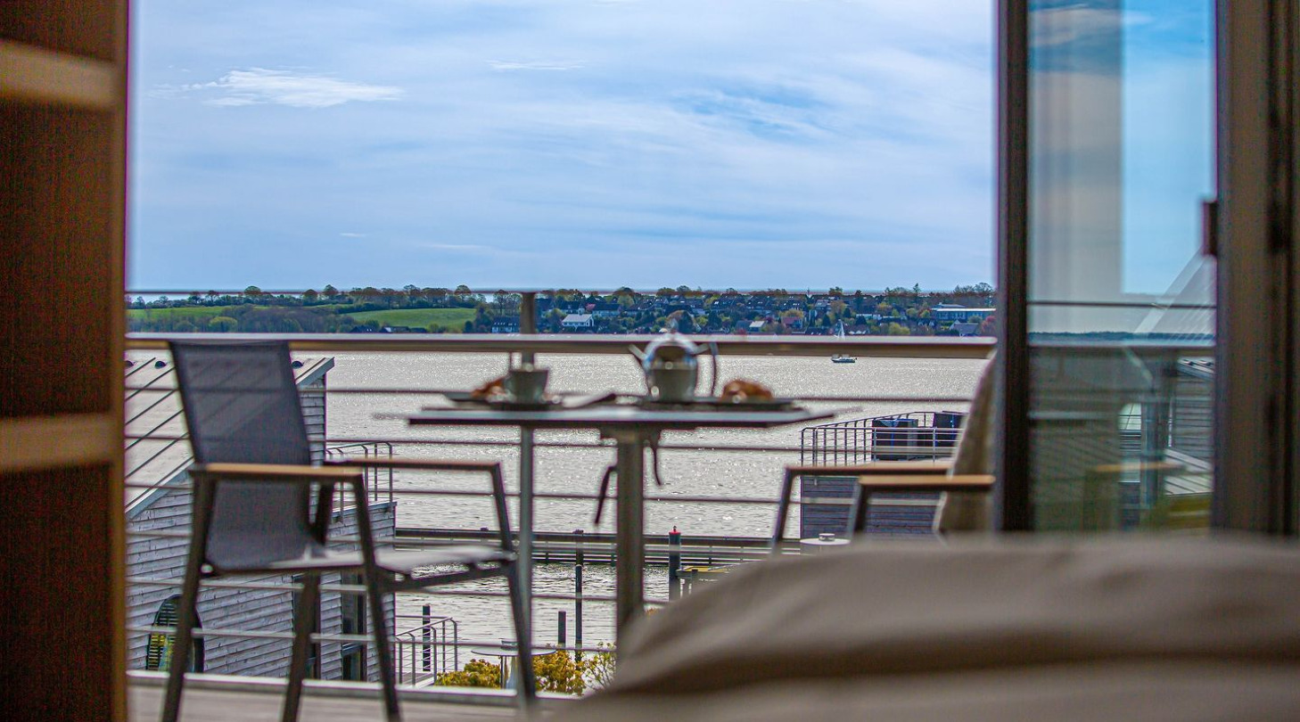 With a direct view of the water and in a unique location directly on the Schlei, “Viking berth 4” at Pionierhafen Schleswig offers the perfect place for your vacation. The apartment on the 1st floor offers an open living and dining area with kitchen and adjoining open bedroom, a bathroom and a balcony on approx. 45m². The fully equipped kitchen leaves nothing to be desired and in the living room you can end your vacation days on the sofa in front of the Smart TV. The bedroom offers a cozy double bed (180x200cm), as well as blackout options for restful nights. In the bathroom you will find a hairdryer and a shower. You can relax on the balcony and round off your vacation days on balmy evenings. A private parking space is available directly in front of the house. You can store your bicycles in the open, shared bicycle room. A washing machine for communal use is available free of charge on the first floor of the neighboring Fjord- and Schleikojen houses. Sustainability is important at Pionierhafen, which is why 77% of the energy is supplied by geothermal energy. The building has an elevator. Your four-legged friend is also very welcome.