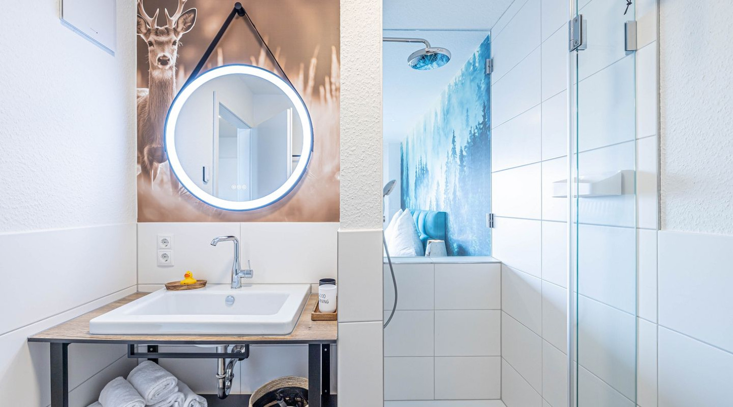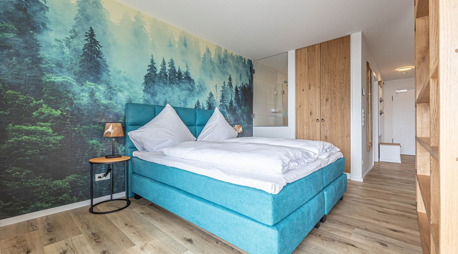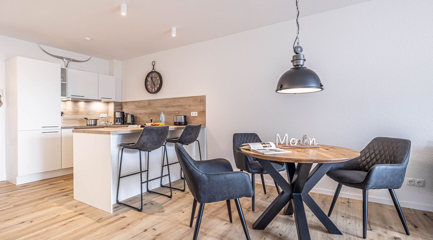 With a direct view of the water and in a unique location directly on the Schlei, “Viking berth 4” at Pionierhafen Schleswig offers the perfect place for your vacation. The apartment on the 1st floor offers an open living and dining area with kitchen and adjoining open bedroom, a bathroom and a balcony on approx. 45m². The fully equipped kitchen leaves nothing to be desired and in the living room you can end your vacation days on the sofa in front of the Smart TV. The bedroom offers a cozy double bed (180x200cm), as well as blackout options for restful nights. In the bathroom you will find a hairdryer and a shower. You can relax on the balcony and round off your vacation days on balmy evenings. A private parking space is available directly in front of the house. You can store your bicycles in the open, shared bicycle room. A washing machine for communal use is available free of charge on the first floor of the neighboring Fjord- and Schleikojen houses. Sustainability is important at Pionierhafen, which is why 77% of the energy is supplied by geothermal energy. The building has an elevator. Your four-legged friend is also very welcome.