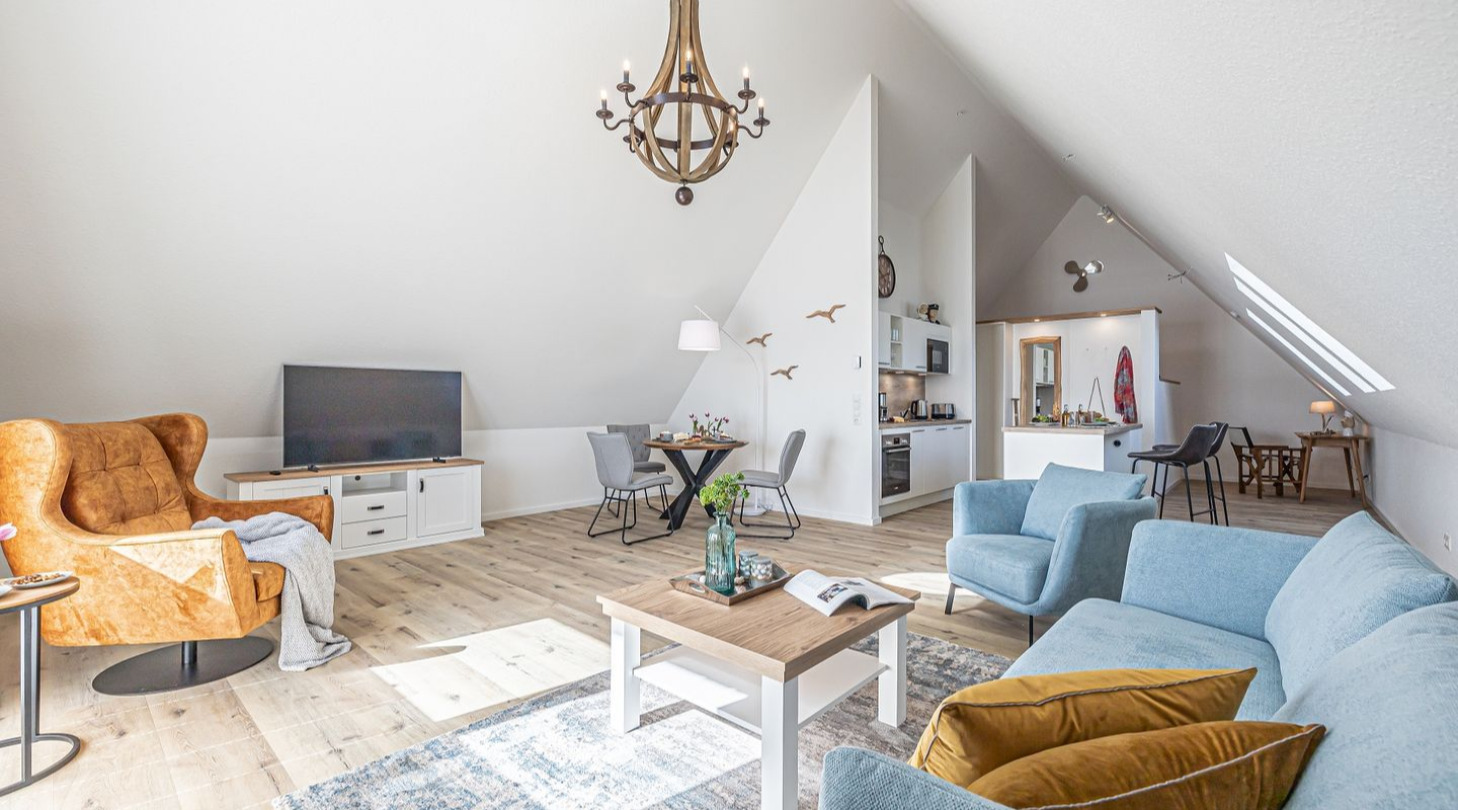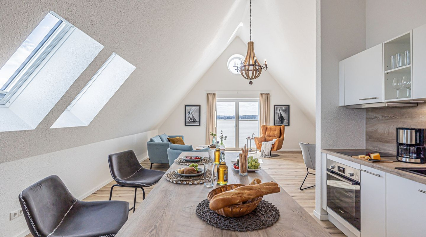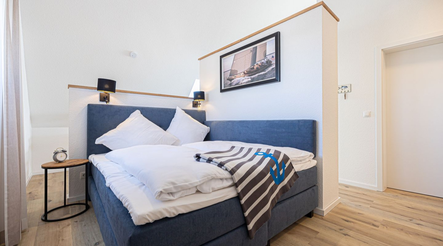 With a direct view of the water and in a unique location directly on the Schlei, “Fjord berth 6” at Pionierhafen Schleswig offers the perfect place for your vacation. The spacious 66 m² apartment offers an open-plan living and dining area with kitchen and sleeping area, a bathroom and a balcony. The fully equipped kitchen leaves nothing to be desired and in the living room you can end your vacation days on the sofa in front of the Smart TV. The sleeping area offers a comfortable double bed (180x200cm) and blackout facilities for restful nights. In the bathroom you will find a hairdryer and a shower. You can relax on the balcony and round off your vacation days on balmy evenings. A private parking space is available directly in front of the house. You can store your bicycles in the open, shared bicycle room. There is a washing machine on the first floor for communal use free of charge. Sustainability is important at Pionierhafen, which is why 77% of the energy is supplied by geothermal energy.