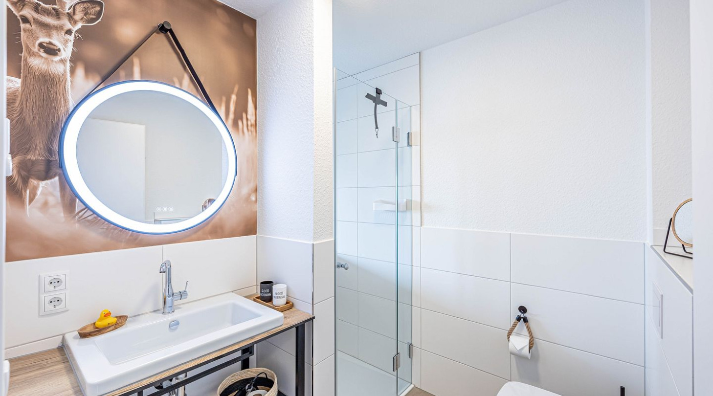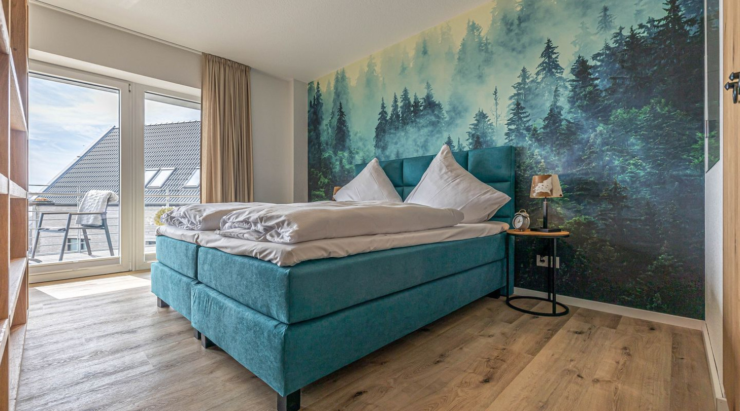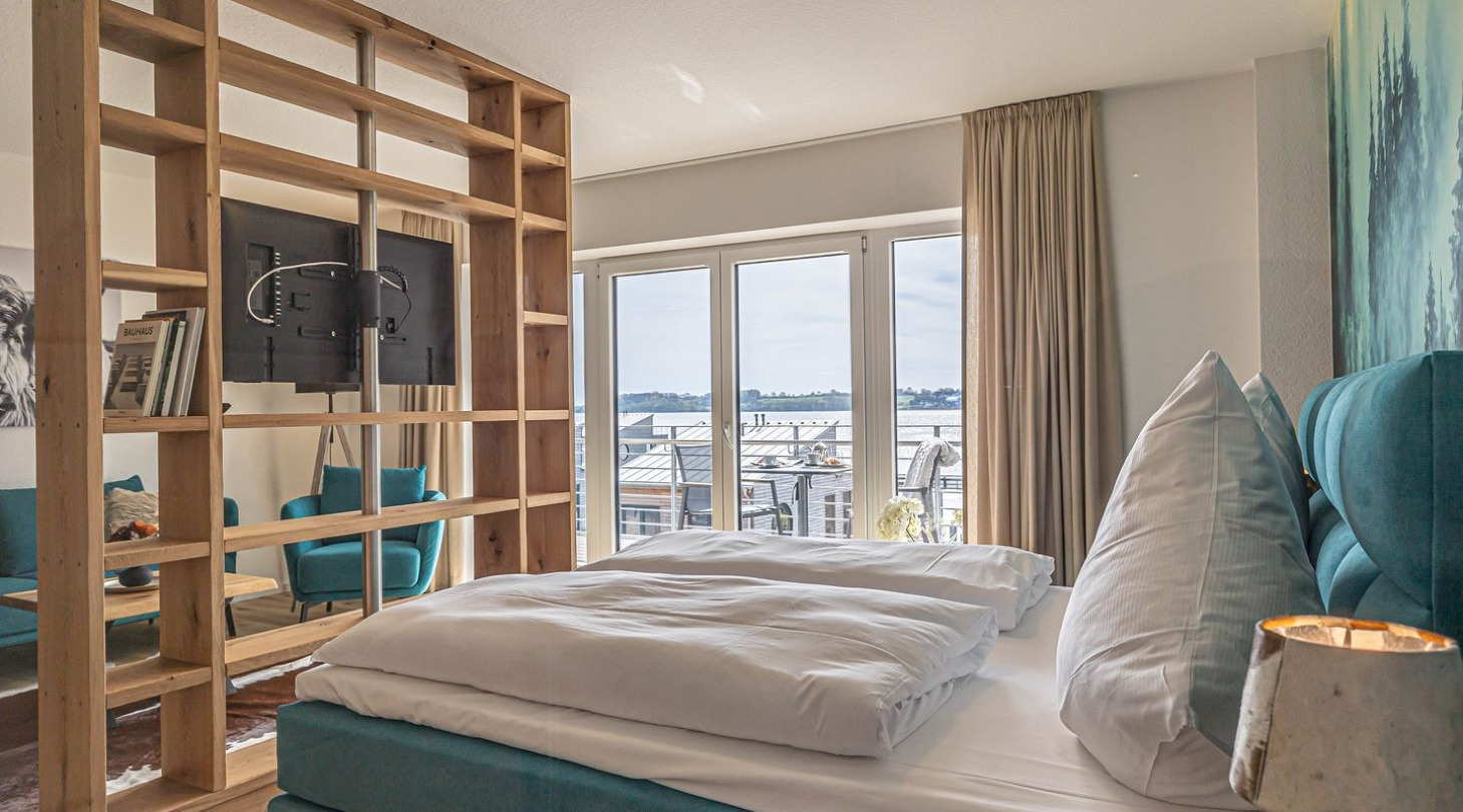 With a direct view of the water and in a unique location directly on the Schlei, the low-barrier apartment “Viking berth 7” at Pionierhafen Schleswig offers the perfect place for your vacation. The apartment on the 2nd floor is barrier-free and offers an open living and dining area with kitchen and adjoining open bedroom, a bathroom and a balcony on approx. 45m². The fully equipped kitchen leaves nothing to be desired and in the living room you can end your vacation days on the sofa in front of the Smart TV. The bedroom offers a cozy double bed (180x200cm) as well as blackout options for restful nights. In the bathroom you will find a hairdryer and a shower with a grab rail. You can relax on the balcony and round off your vacation days on balmy evenings. A private parking space is available directly in front of the house. You can store your bicycles in the open, shared bicycle room. A washing machine for communal use is available free of charge on the first floor of the neighboring Fjord- and Schleikojen houses. Sustainability is important at Pionierhafen, which is why 77% of the energy is supplied by geothermal energy. The building has an elevator.
