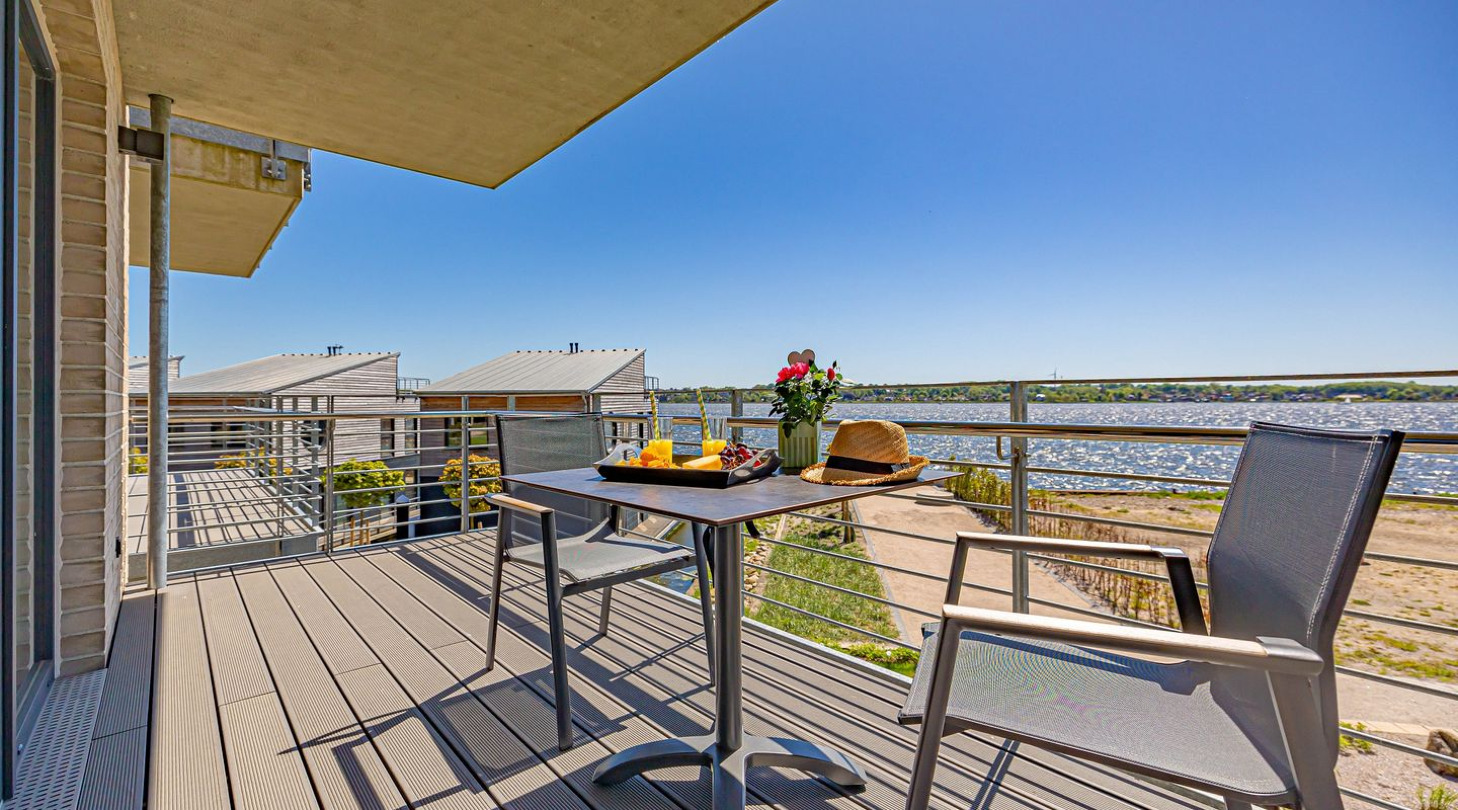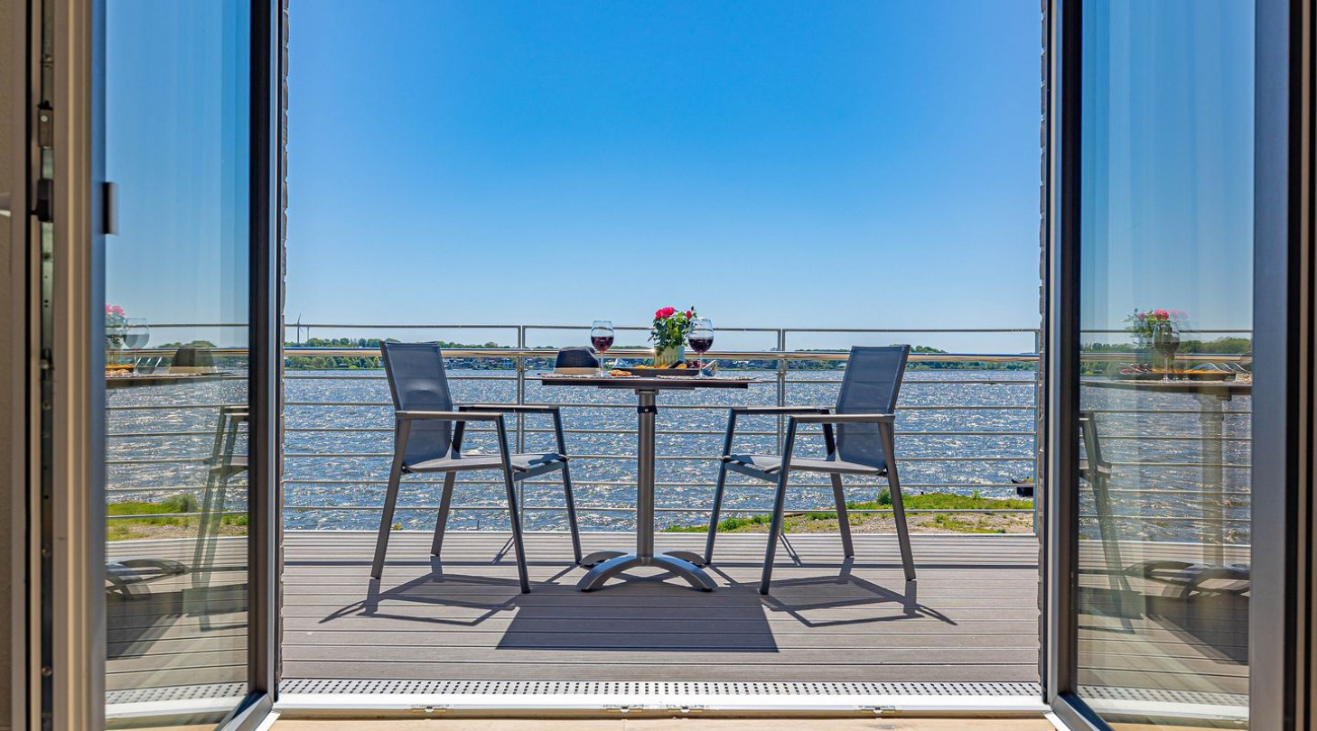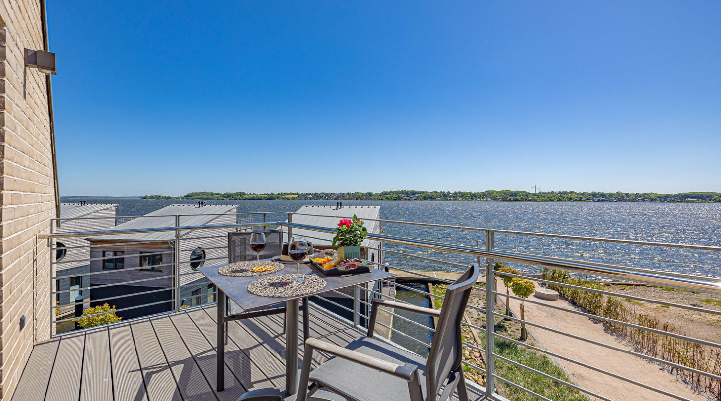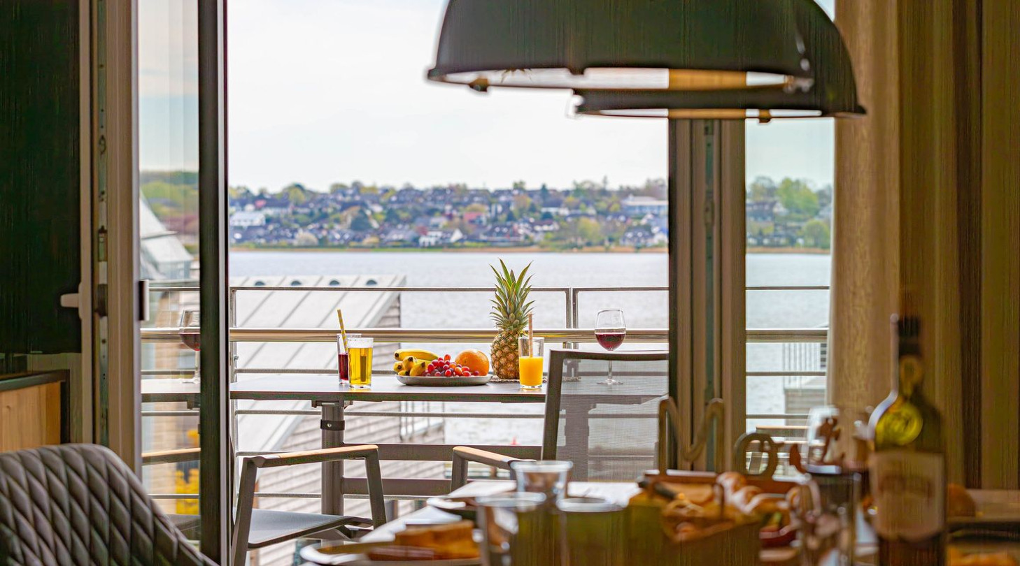 With a direct view of the water and in a unique location directly on the Schlei, “Schlei berth 8” at Pionierhafen Schleswig offers the perfect place for your vacation. The apartment on the top floor offers an open living and dining area with kitchen, a bedroom, a bathroom and a balcony on approx. 66m². The fully equipped kitchen leaves nothing to be desired and in the living room you can end your vacation days on the sofa in front of the Smart TV. The bedroom offers a cozy double bed (180x200cm) as well as blackout options for restful nights. In the bathroom you will find a hairdryer and a shower. You can relax on the balcony and round off your vacation days on balmy evenings. A private parking space is available directly in front of the house. You can store your bicycles in the open, shared bicycle room. There is a washing machine on the first floor for communal use free of charge. Sustainability is important at Pionierhafen, which is why 77% of the energy is supplied by geothermal energy.