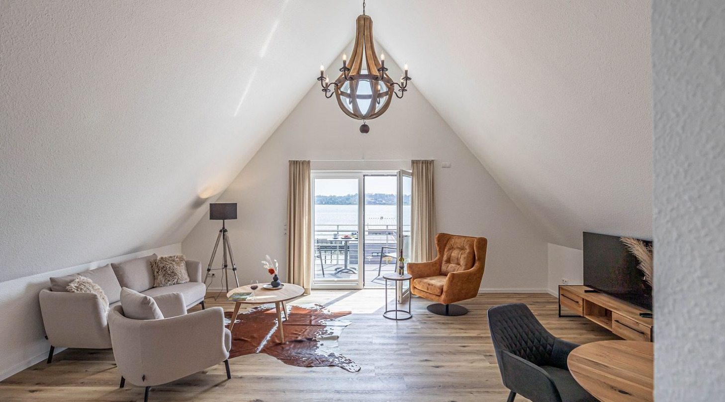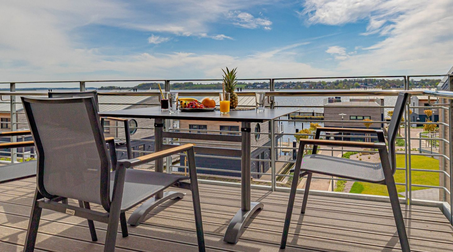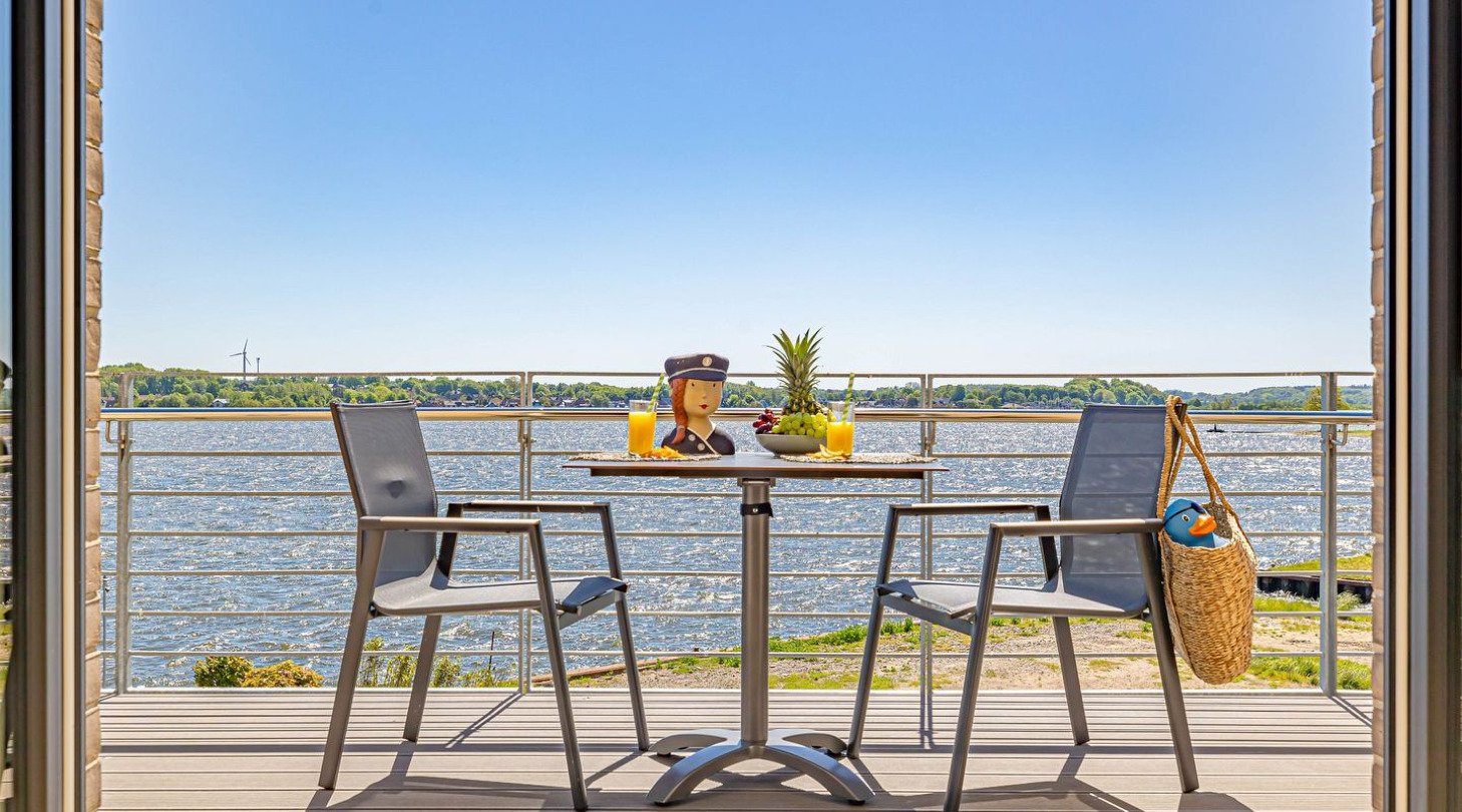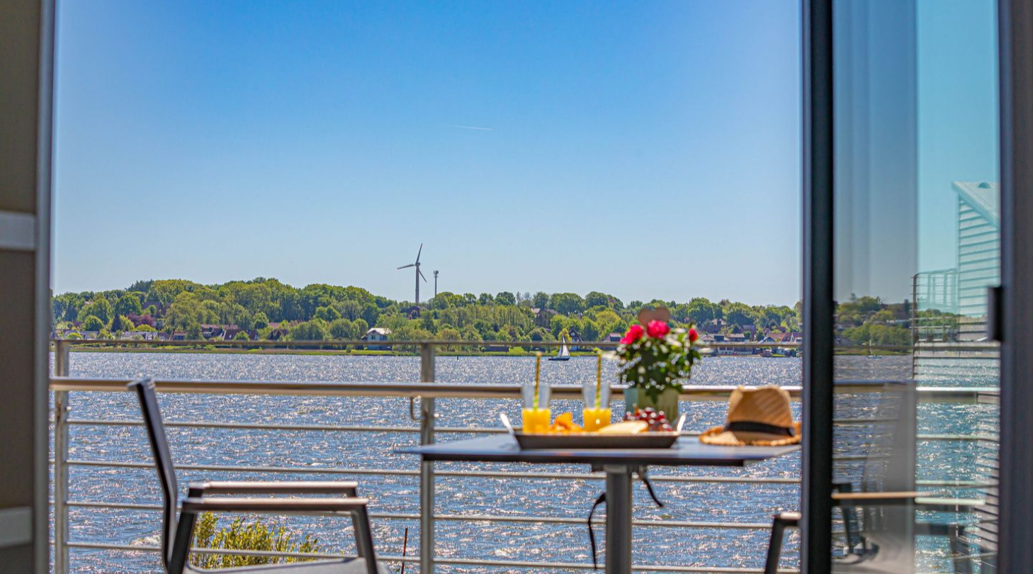 With a direct view of the water and in a unique location directly on the Schlei, “Schlei berth 8” at Pionierhafen Schleswig offers the perfect place for your vacation. The apartment on the top floor offers an open living and dining area with kitchen, a bedroom, a bathroom and a balcony on approx. 66m². The fully equipped kitchen leaves nothing to be desired and in the living room you can end your vacation days on the sofa in front of the Smart TV. The bedroom offers a cozy double bed (180x200cm) as well as blackout options for restful nights. In the bathroom you will find a hairdryer and a shower. You can relax on the balcony and round off your vacation days on balmy evenings. A private parking space is available directly in front of the house. You can store your bicycles in the open, shared bicycle room. There is a washing machine on the first floor for communal use free of charge. Sustainability is important at Pionierhafen, which is why 77% of the energy is supplied by geothermal energy.