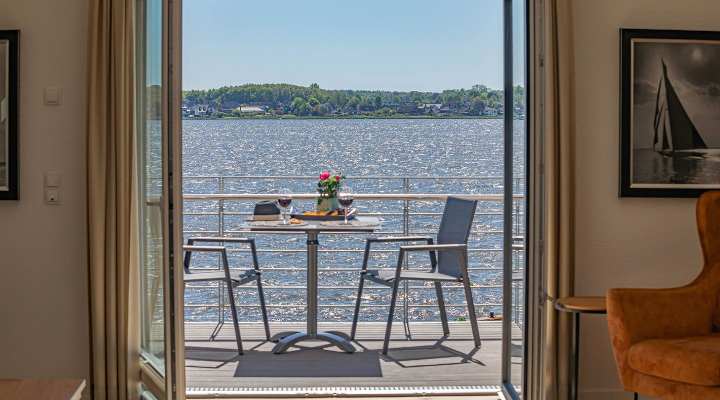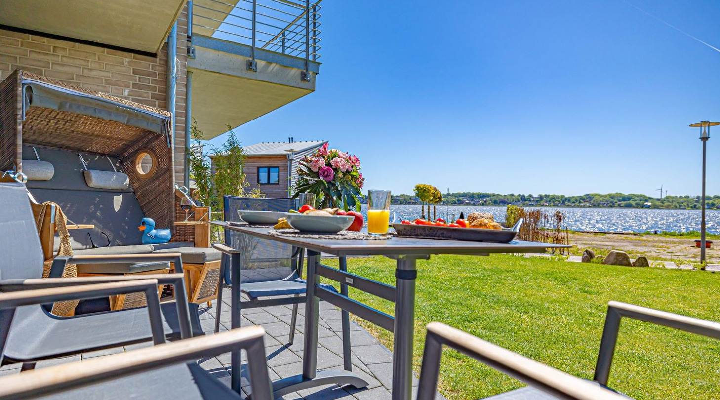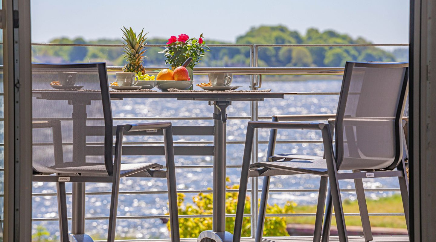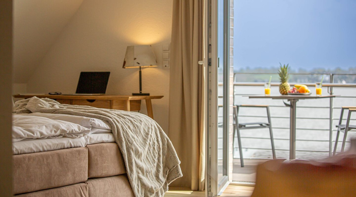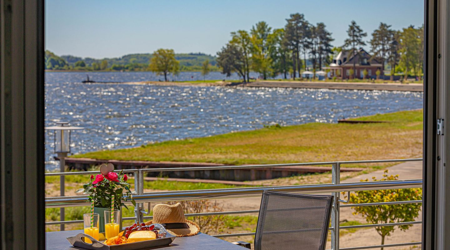 With a direct view of the water and in a unique location directly on the Schlei, “Schlei berth 8” at Pionierhafen Schleswig offers the perfect place for your vacation. The apartment on the top floor offers an open living and dining area with kitchen, a bedroom, a bathroom and a balcony on approx. 66m². The fully equipped kitchen leaves nothing to be desired and in the living room you can end your vacation days on the sofa in front of the Smart TV. The bedroom offers a cozy double bed (180x200cm) as well as blackout options for restful nights. In the bathroom you will find a hairdryer and a shower. You can relax on the balcony and round off your vacation days on balmy evenings. A private parking space is available directly in front of the house. You can store your bicycles in the open, shared bicycle room. There is a washing machine on the first floor for communal use free of charge. Sustainability is important at Pionierhafen, which is why 77% of the energy is supplied by geothermal energy.