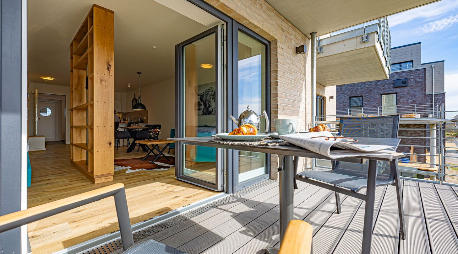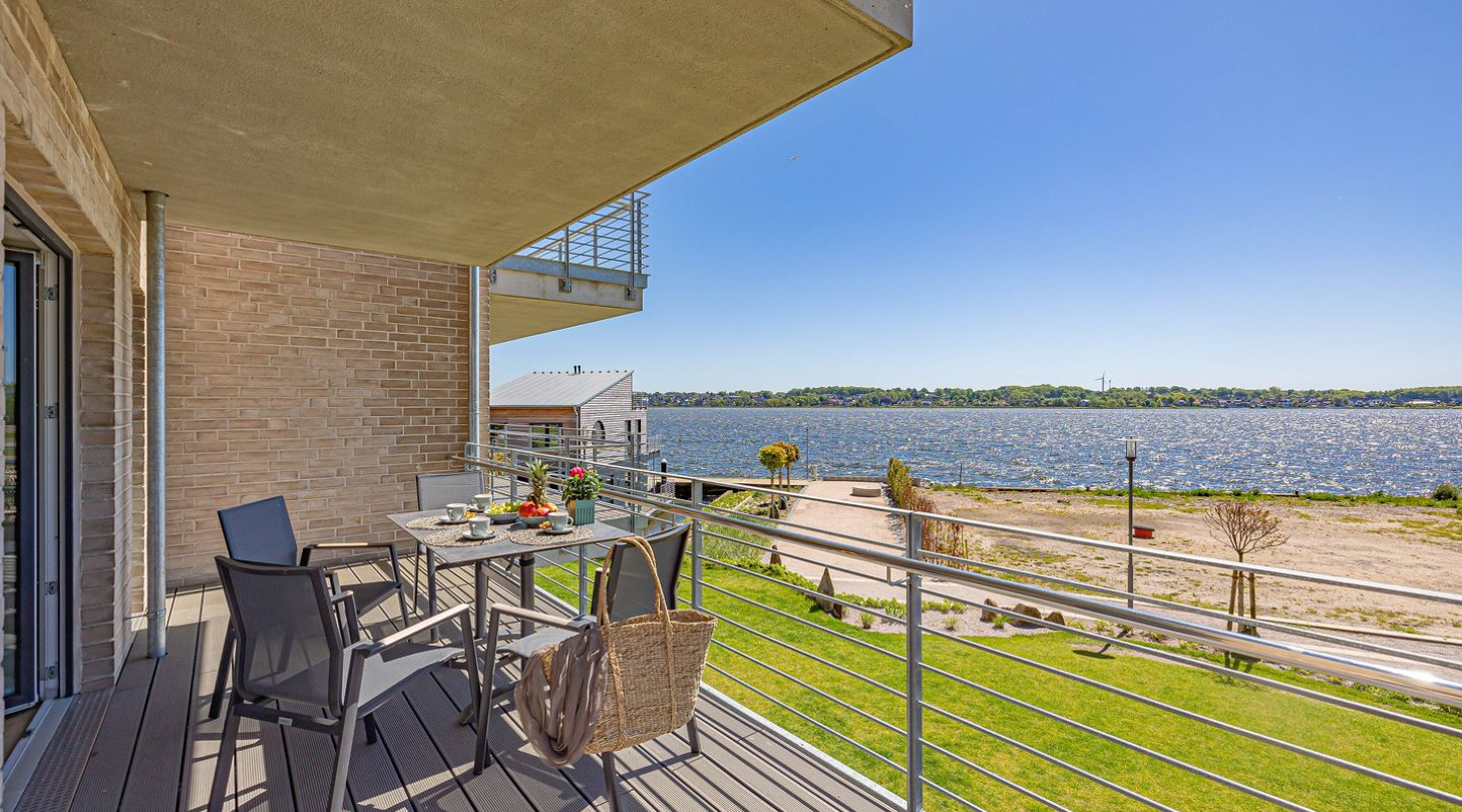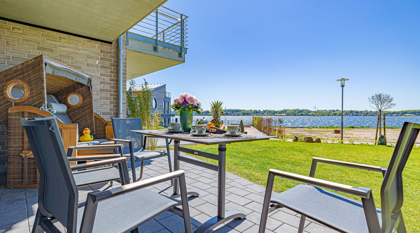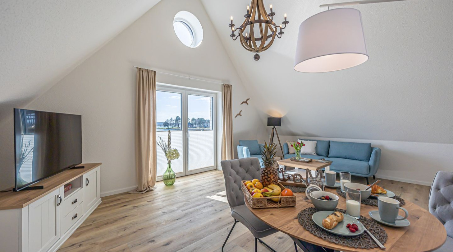 With a direct view of the water and in a unique location directly on the Schlei, “Schlei berth 8” at Pionierhafen Schleswig offers the perfect place for your vacation. The apartment on the top floor offers an open living and dining area with kitchen, a bedroom, a bathroom and a balcony on approx. 66m². The fully equipped kitchen leaves nothing to be desired and in the living room you can end your vacation days on the sofa in front of the Smart TV. The bedroom offers a cozy double bed (180x200cm) as well as blackout options for restful nights. In the bathroom you will find a hairdryer and a shower. You can relax on the balcony and round off your vacation days on balmy evenings. A private parking space is available directly in front of the house. You can store your bicycles in the open, shared bicycle room. There is a washing machine on the first floor for communal use free of charge. Sustainability is important at Pionierhafen, which is why 77% of the energy is supplied by geothermal energy.