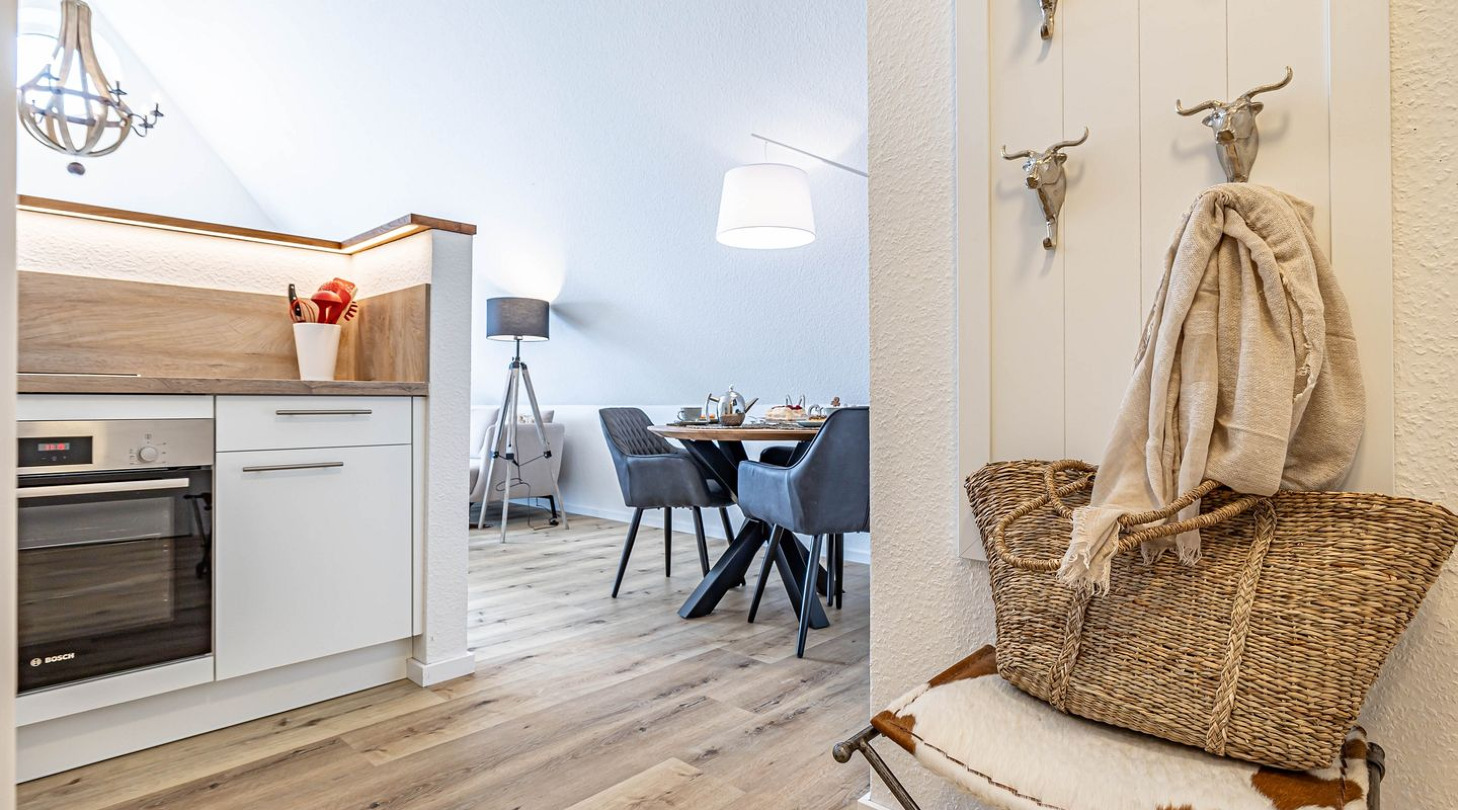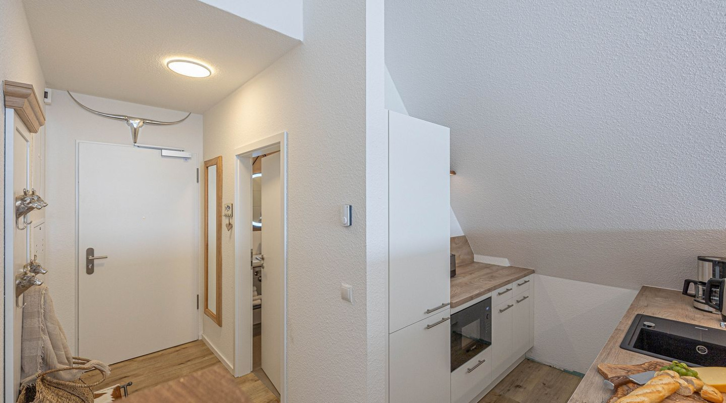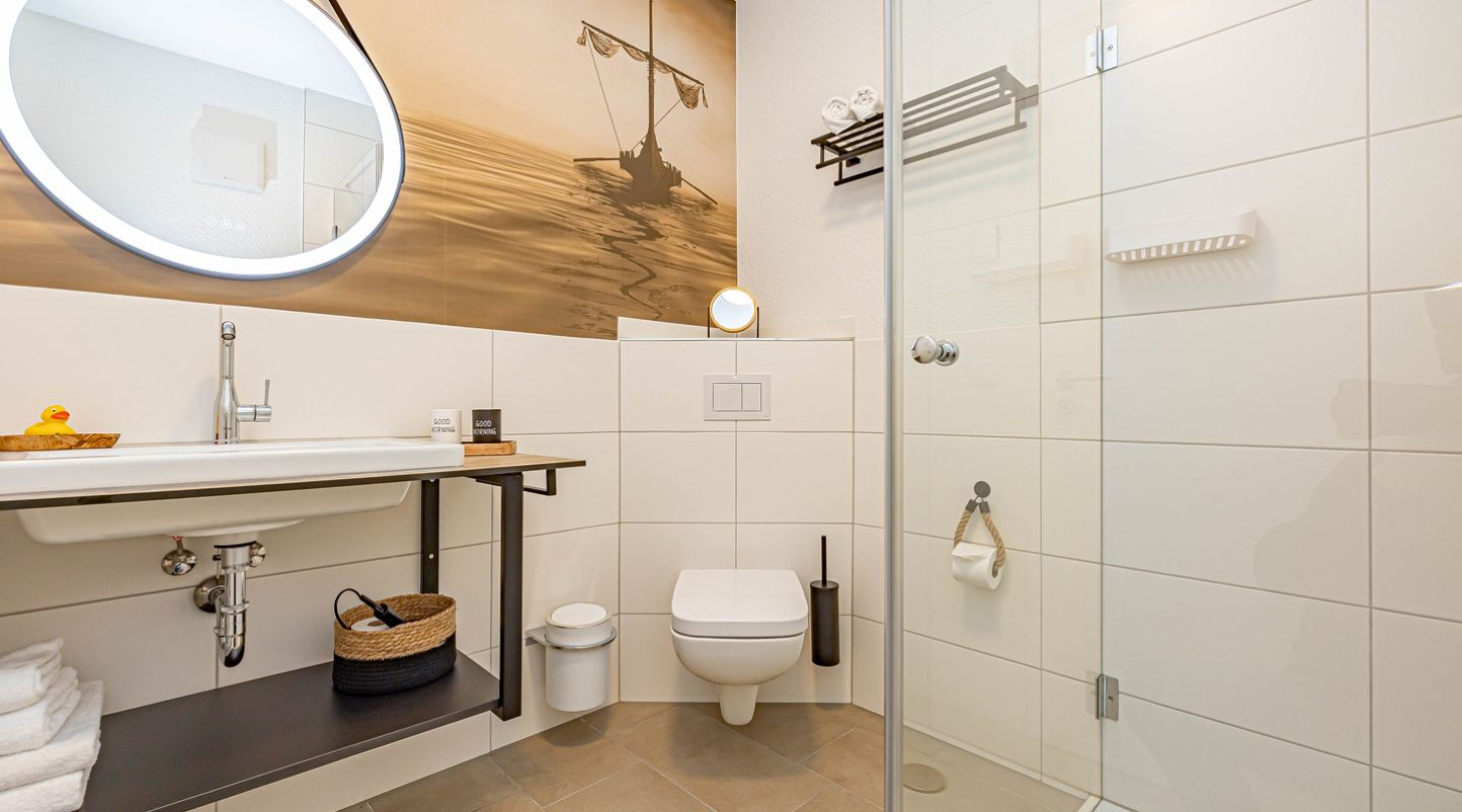 With a direct view of the water and in a unique location directly on the Schlei, the “Viking berth 10” at the Pionierhafen Schleswig offers the perfect place for your vacation. The apartment on the 3rd floor offers an open living and dining area with kitchen and adjoining open bedroom, a bathroom and a balcony on approx. 40m². The fully equipped kitchen leaves nothing to be desired and in the living room you can end your vacation days on the sofa in front of the Smart TV. The bedroom offers a cozy double bed (180x200cm), as well as blackout options for restful nights. In the bathroom you will find a hairdryer and a shower. You can relax on the balcony and round off your vacation days on balmy evenings. A private parking space is available directly in front of the house. You can store your bicycles in the open, shared bicycle room. A washing machine for communal use is available free of charge on the first floor of the neighboring Fjord- and Schleikojen houses. Sustainability is important at Pionierhafen, which is why 77% of the energy is supplied by geothermal energy. The building has an elevator.