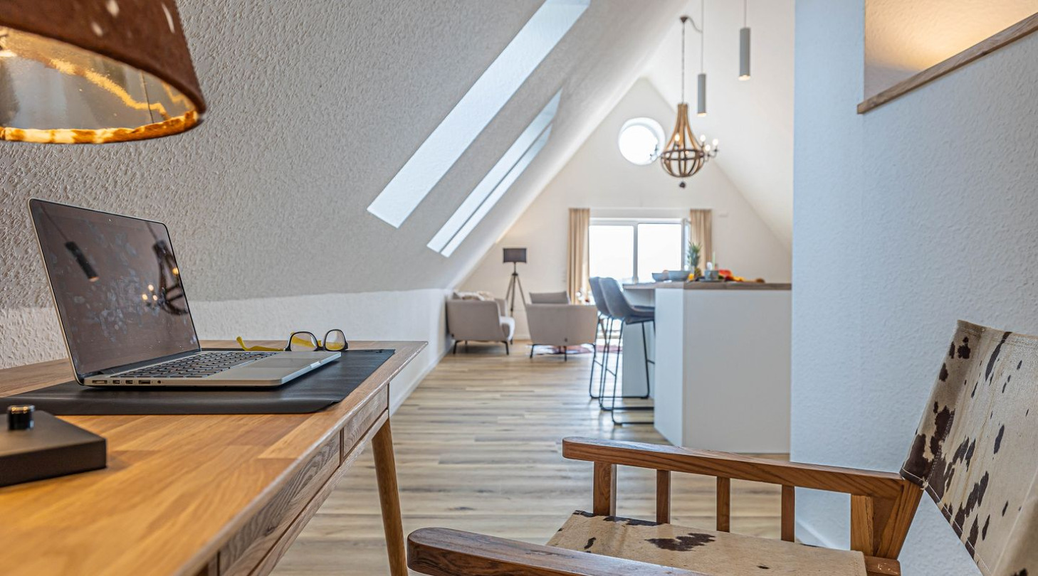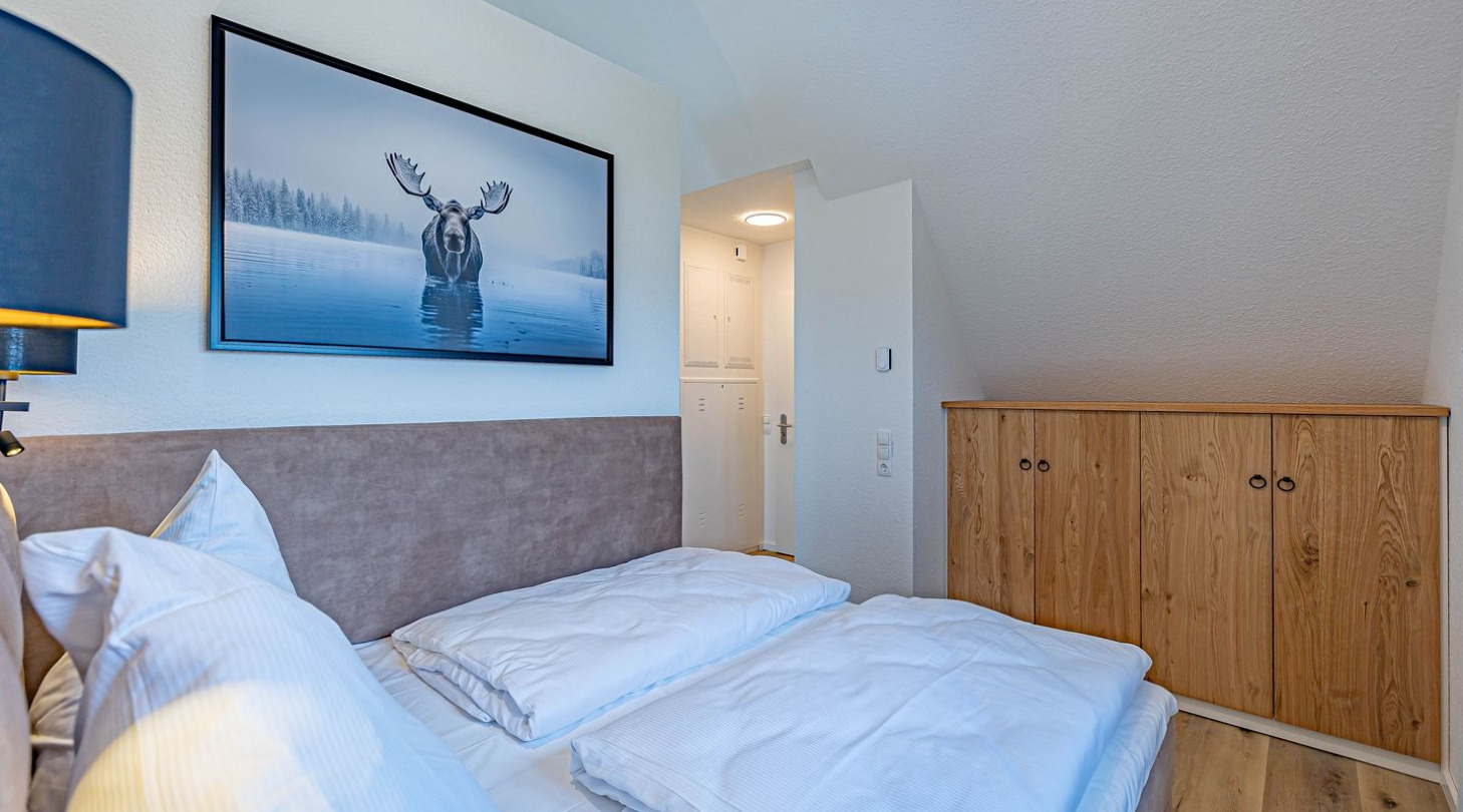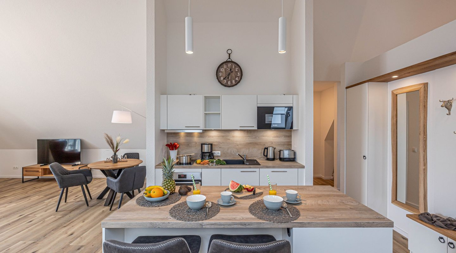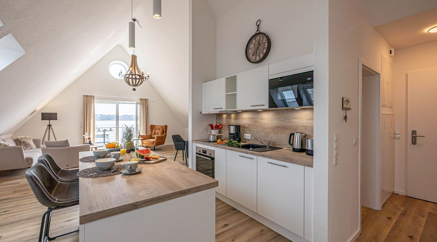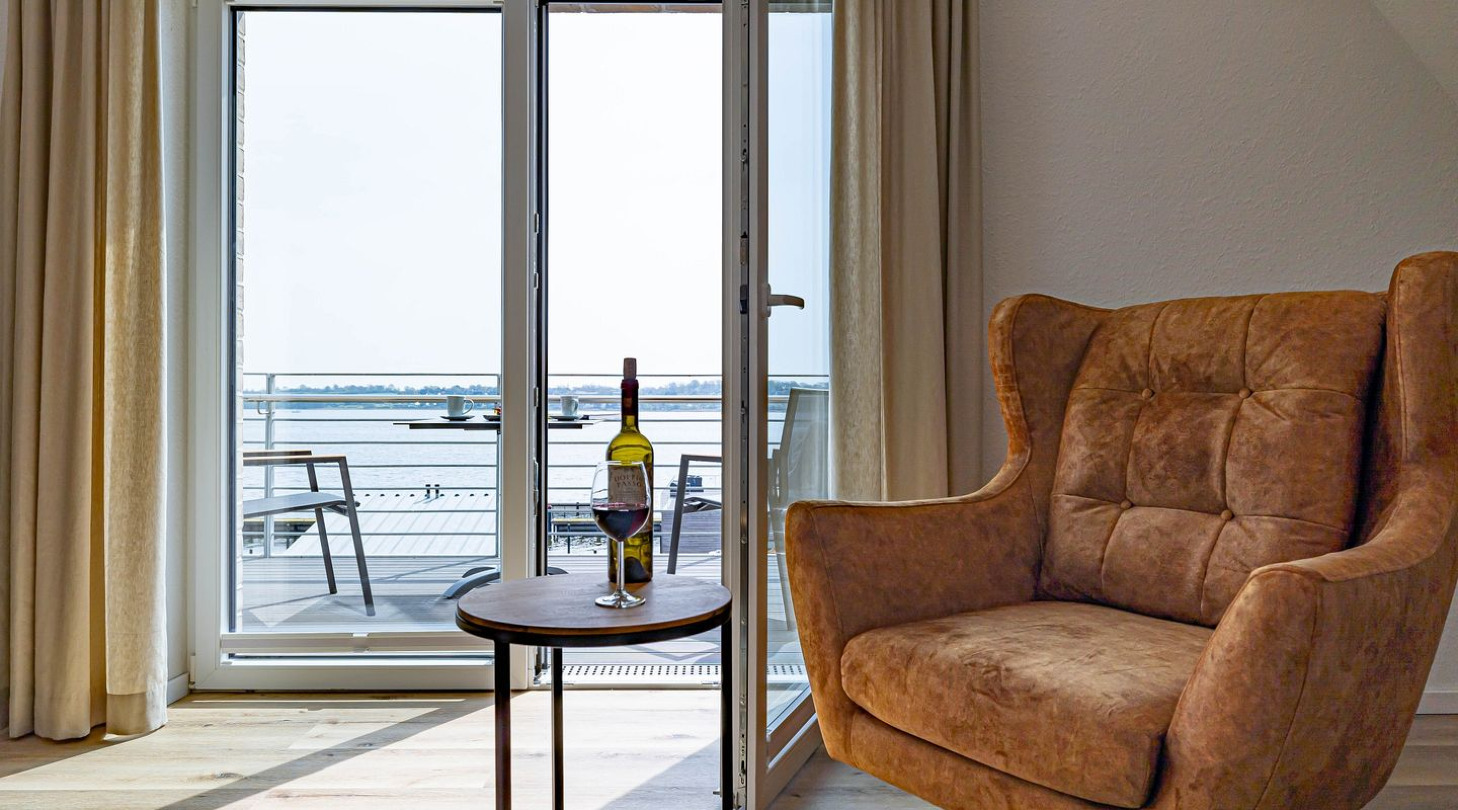 With a direct view of the water and in a unique location directly on the Schlei, the “Viking berth 11” at the Pionierhafen Schleswig offers the perfect place for your vacation. The spacious 66m² apartment offers an open-plan living and dining area with kitchen and sleeping area, a bathroom and a balcony. The fully equipped kitchen leaves nothing to be desired and in the living room you can end your vacation days on the sofa in front of the Smart TV. The sleeping area offers a comfortable double bed (180x200cm), as well as blackout facilities for restful nights. In the bathroom you will find a hairdryer and a shower. You can relax on the balcony and round off your vacation days on balmy evenings. A private parking space is available directly in front of the house. You can store your bicycles in the open, shared bicycle room. There is a washing machine on the first floor for communal use free of charge. Sustainability is important at Pionierhafen, which is why 77% of the energy is supplied by geothermal energy. The building has an elevator.