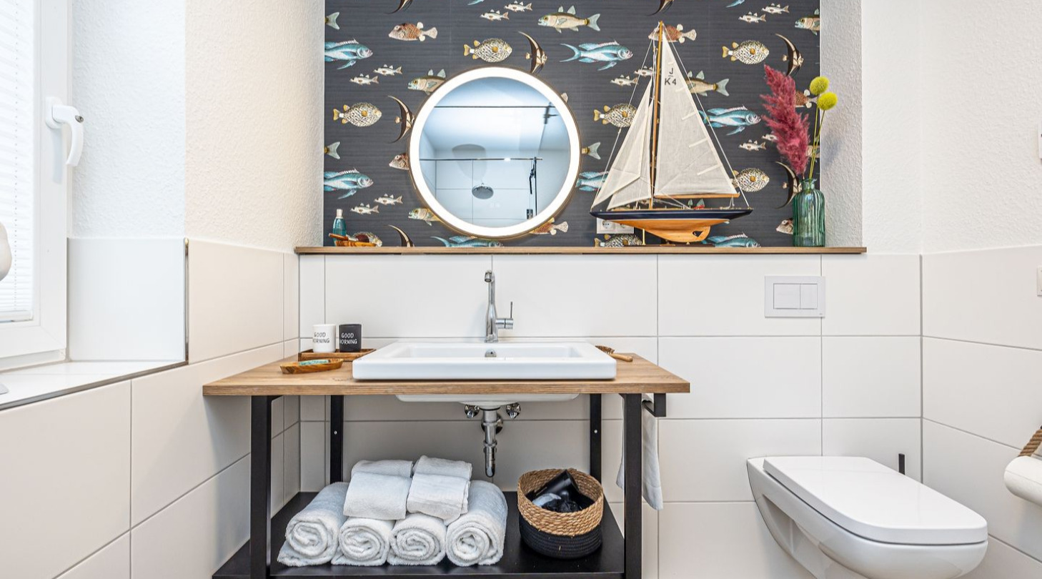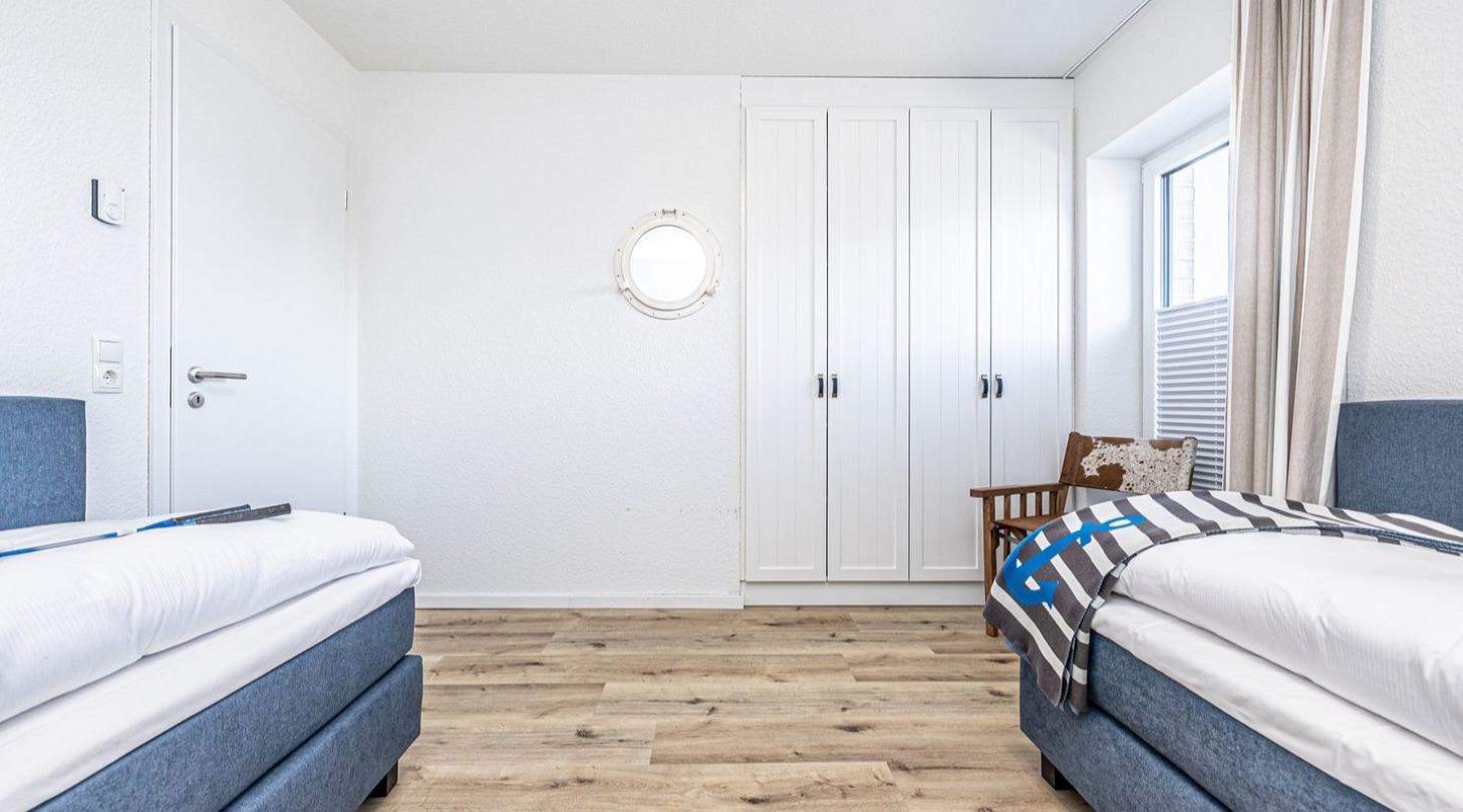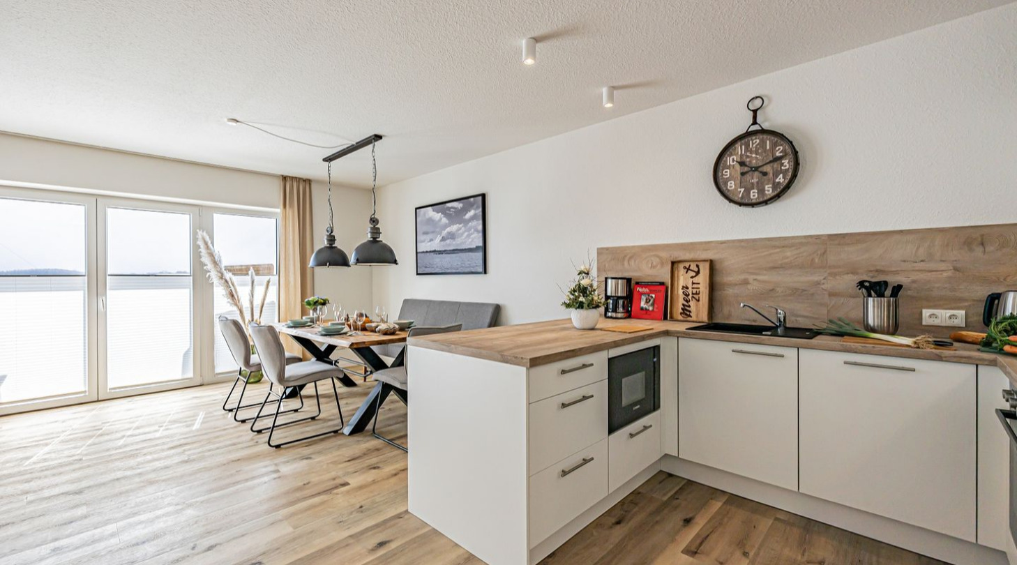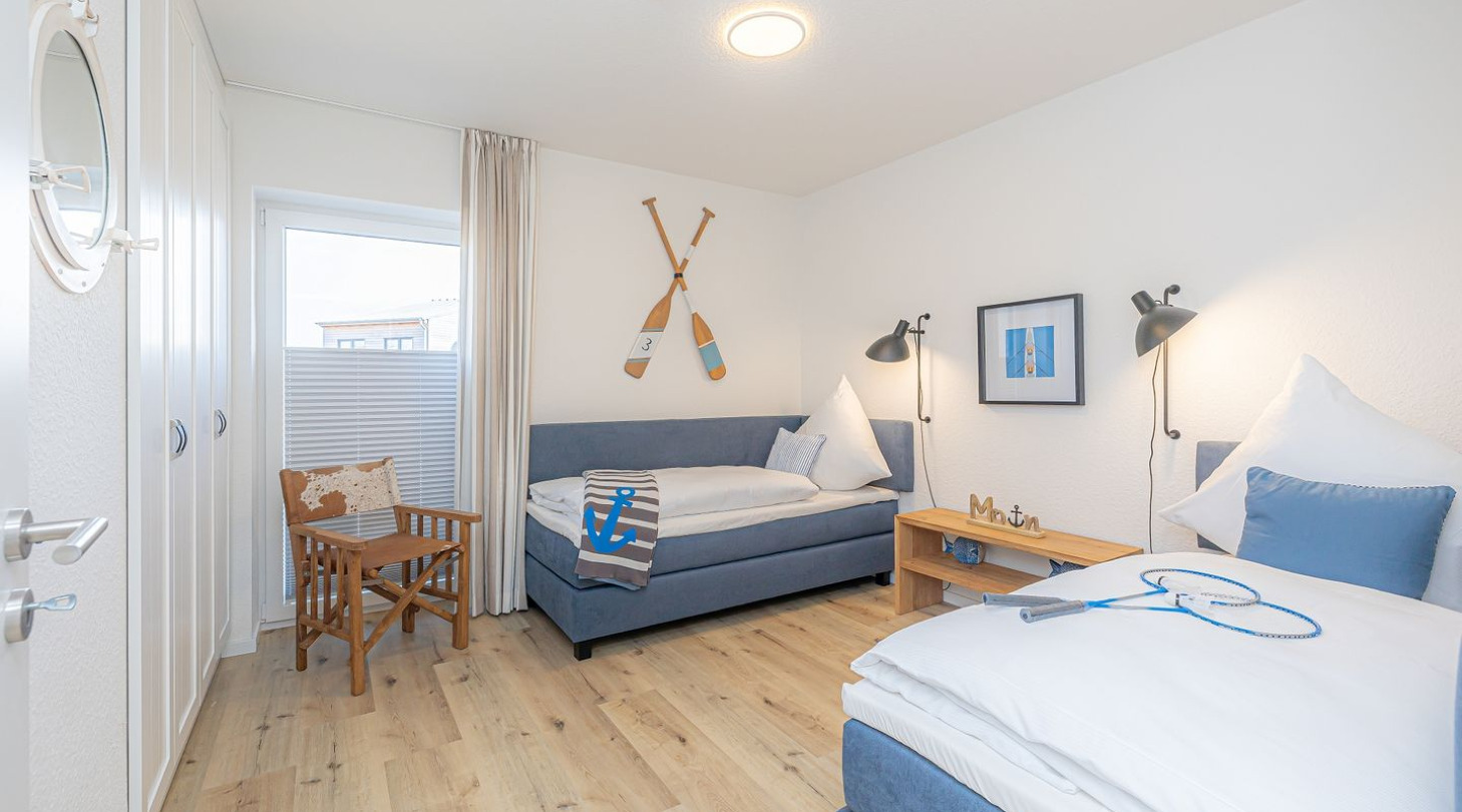 With a direct view of the water and in a unique location directly on the Schlei, “Fjord berth 1” at Pionierhafen Schleswig offers the perfect place for your vacation. The 116 m² apartment offers an open-plan living and dining area with kitchen, three bedrooms, two bathrooms and a terrace. The fully equipped kitchen leaves nothing to be desired and in the living room you can end your vacation days on the sofa in front of the Smart TV. Two of the three bedrooms each offer a comfortable double bed (180 × 200 cm) as well as blackout options for restful nights. One bedroom has a flat-screen TV. The third bedroom has two single beds (90 × 200 cm each) and blackout facilities. In one of the two bathrooms you will find a hairdryer and a shower. And the absolute highlight: a Finnish sauna! Here you can warm up and relax after long walks on the beach. The second bathroom also has a shower. You can relax on the terrace and end your vacation days in the beach chair on warm evenings and, thanks to the electric barbecue, organize barbecue evenings with the whole family. A private parking space is available directly in front of the house. You can store your bicycles in the open, shared bicycle room. There is a washing machine on the first floor for communal use free of charge. Sustainability is important at Pionierhafen, which is why 77% of the energy is supplied by geothermal energy.
