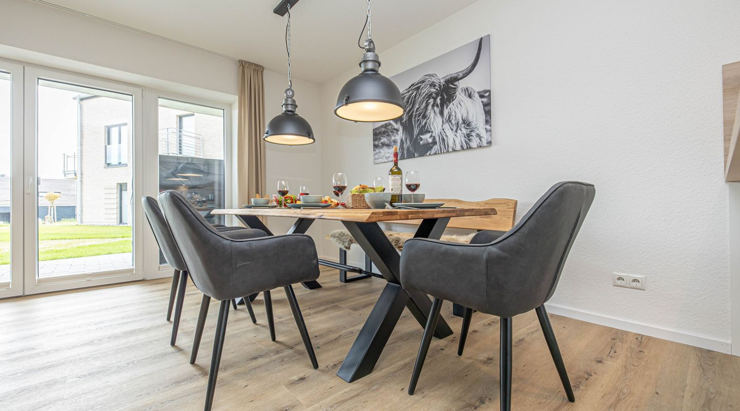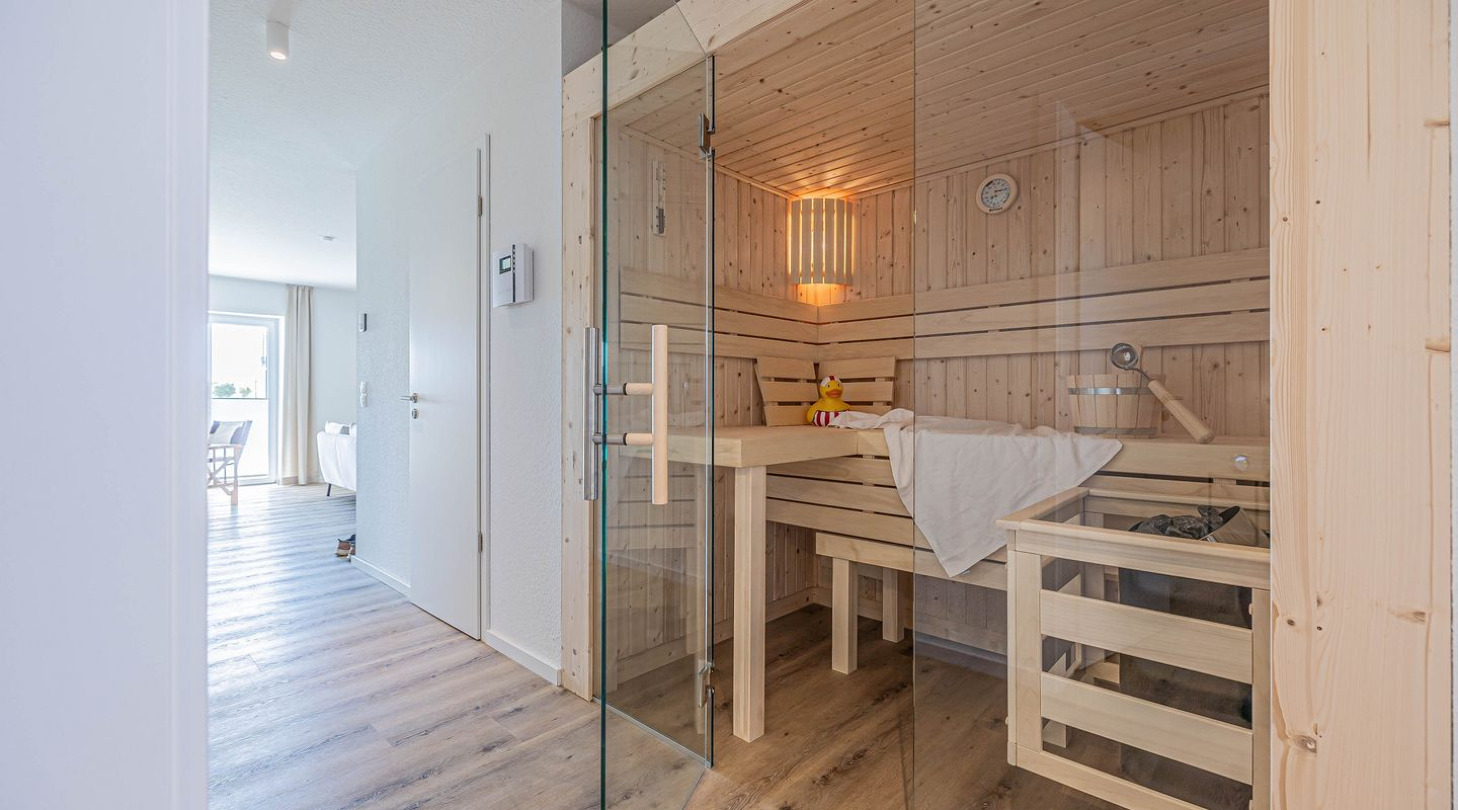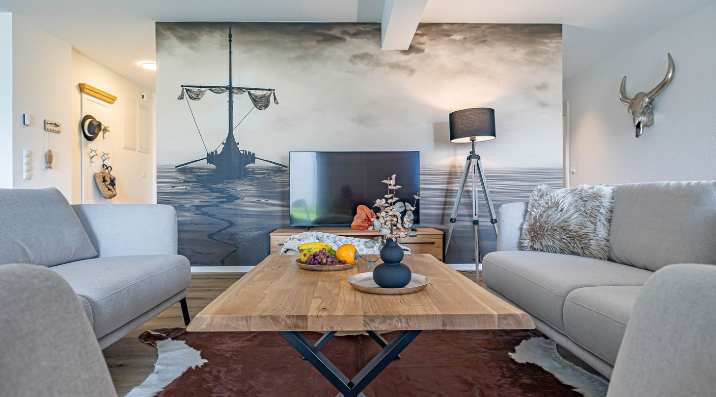 With a direct view of the water and in a unique location directly on the Schlei, the “Viking berth 1” at the Pionierhafen Schleswig offers the perfect place for your vacation. The 116m² apartment offers an open-plan living and dining area with kitchen, three bedrooms, two bathrooms and a terrace. The fully equipped kitchen leaves nothing to be desired and in the living room you can end your vacation days on the sofa in front of the Smart TV. Two of the three bedrooms each offer a comfortable double bed (180x200cm), as well as blackout options for restful nights. One bedroom has a flat-screen TV. The third bedroom has two single beds (90x200cm each) and blackout facilities. In one of the two bathrooms you will find a hairdryer and a shower. And the absolute highlight: a Finnish sauna! Here you can warm up and relax after long walks on the beach. The second bathroom also has a shower. You can relax on the terrace and end your vacation days in a beach chair on warm evenings. A private parking space is available directly in front of the house. You can store your bicycles in the open, shared bicycle room. On the first floor of the neighboring houses Fjord- and Schleikojen there is a washing machine for shared use free of charge. Sustainability is important at Pionierhafen, which is why 77% of the energy is supplied by geothermal energy.