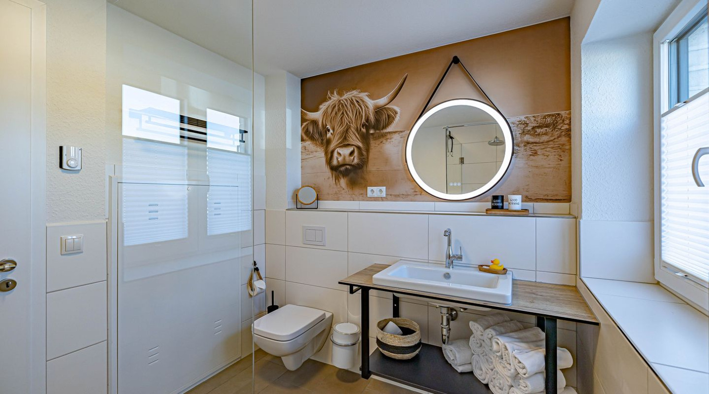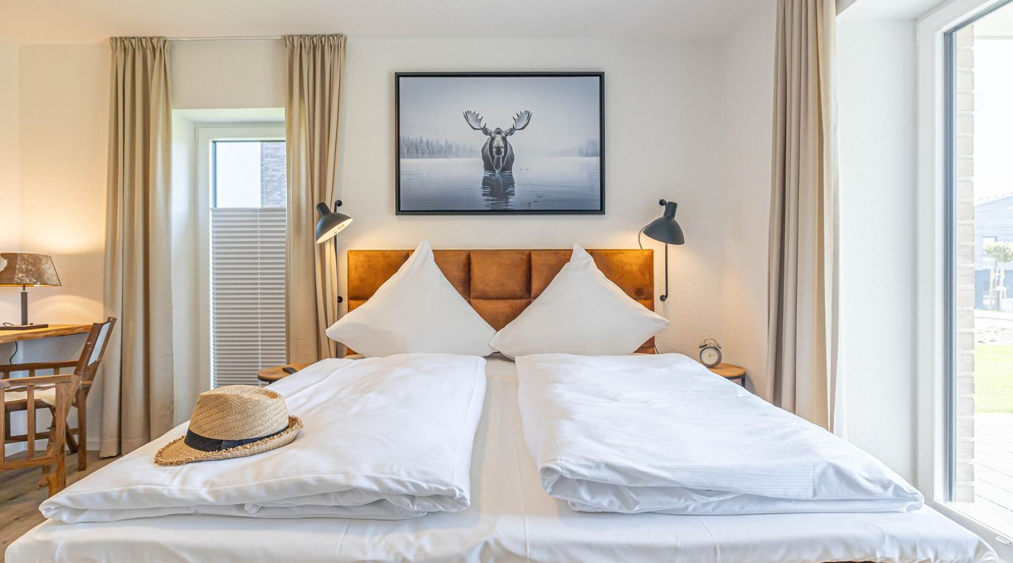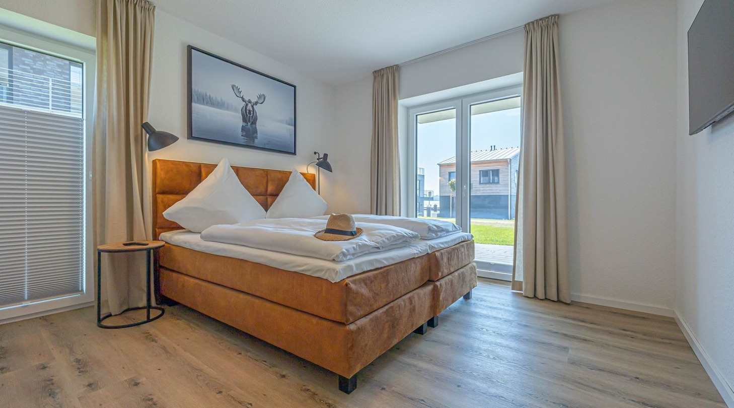 With a direct view of the water and in a unique location directly on the Schlei, the “Viking berth 1” at the Pionierhafen Schleswig offers the perfect place for your vacation. The 116m² apartment offers an open-plan living and dining area with kitchen, three bedrooms, two bathrooms and a terrace. The fully equipped kitchen leaves nothing to be desired and in the living room you can end your vacation days on the sofa in front of the Smart TV. Two of the three bedrooms each offer a comfortable double bed (180x200cm), as well as blackout options for restful nights. One bedroom has a flat-screen TV. The third bedroom has two single beds (90x200cm each) and blackout facilities. In one of the two bathrooms you will find a hairdryer and a shower. And the absolute highlight: a Finnish sauna! Here you can warm up and relax after long walks on the beach. The second bathroom also has a shower. You can relax on the terrace and end your vacation days in a beach chair on warm evenings. A private parking space is available directly in front of the house. You can store your bicycles in the open, shared bicycle room. On the first floor of the neighboring houses Fjord- and Schleikojen there is a washing machine for shared use free of charge. Sustainability is important at Pionierhafen, which is why 77% of the energy is supplied by geothermal energy.